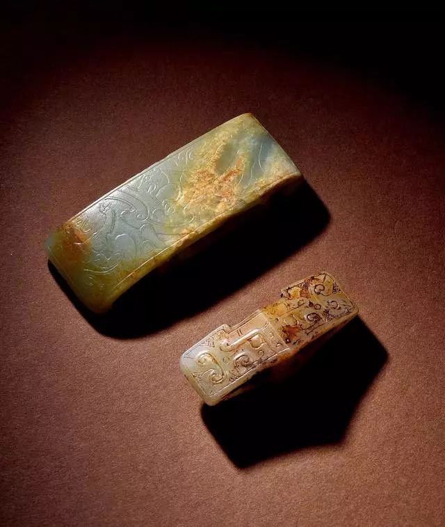 汉 玉螭龙纹出廓剑璏、玉螭龙纹出廓剑珌 (各一件)