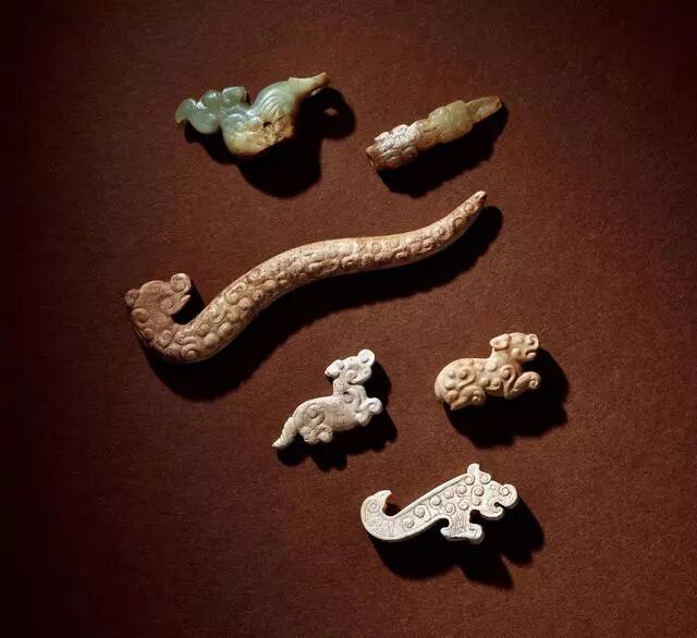 商﹣春秋 玉勾连纹觹一对、谷纹璜一对、螭龙纹璜和鹿各一件