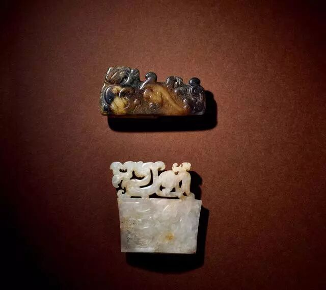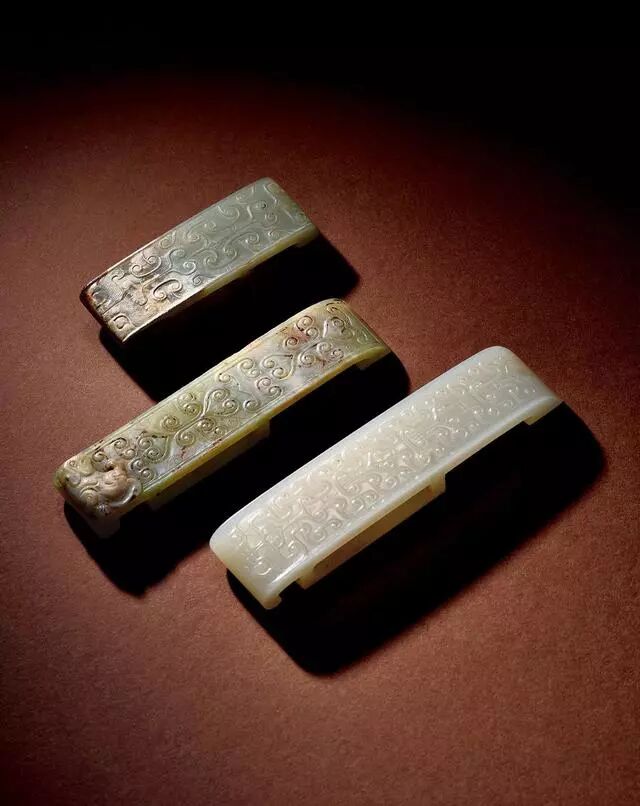 西汉 白玉兽面勾云纹剑璏两件、青玉熊纹勾云纹剑璏一件