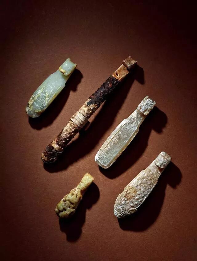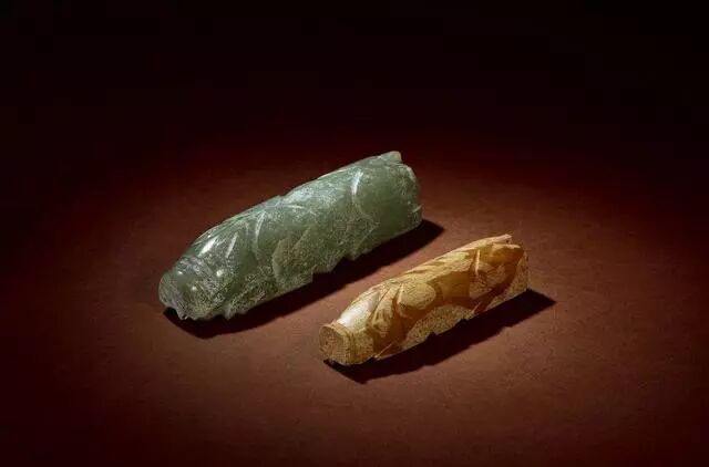文化期﹣战国 玉蚕形觹五件、玉鸟首锥形器两件