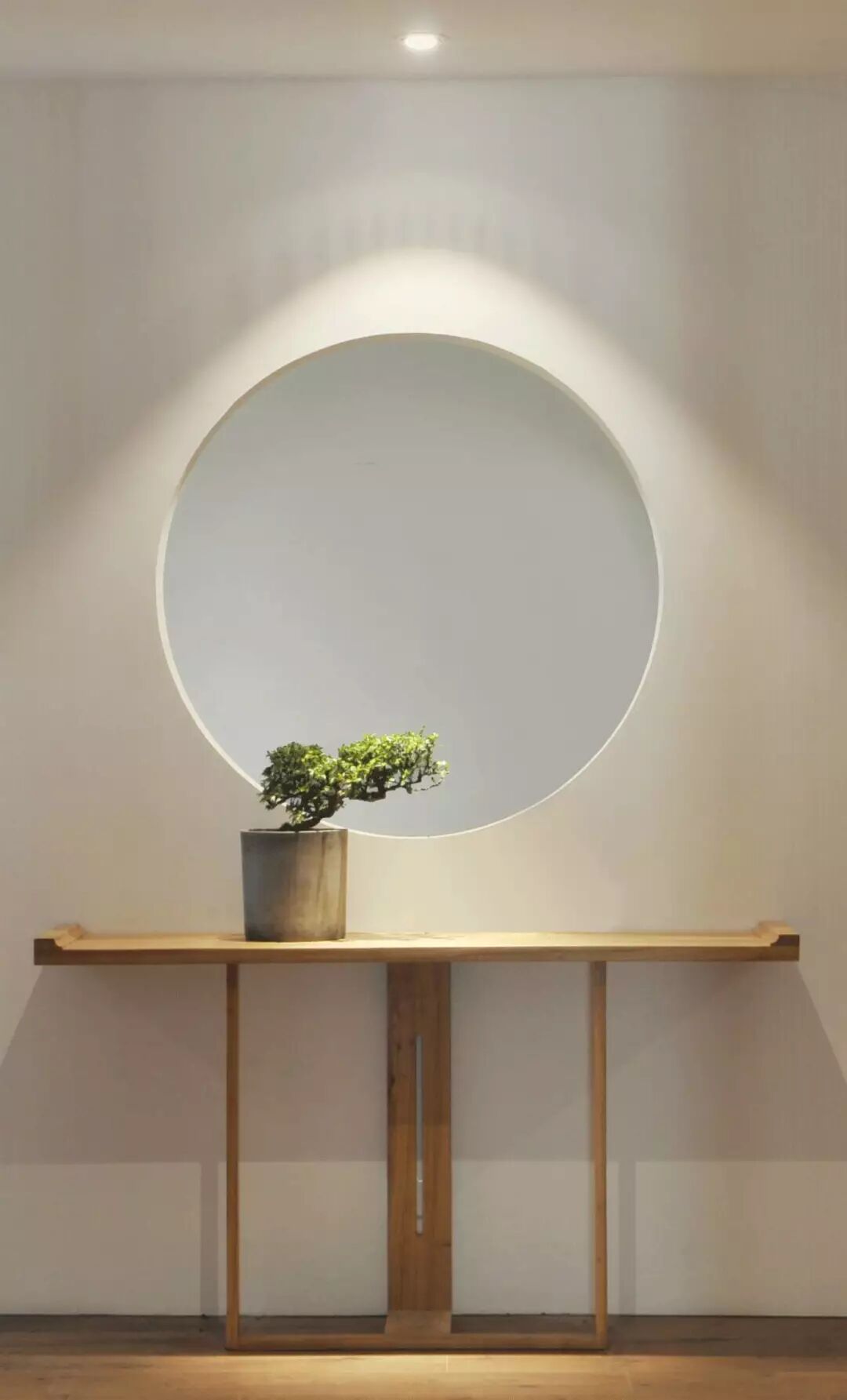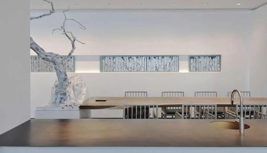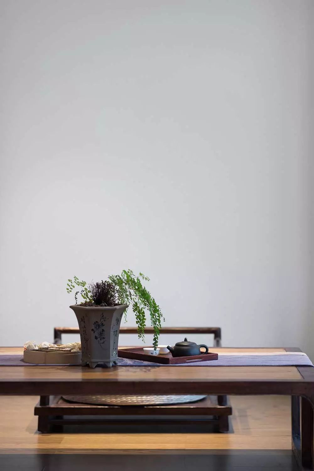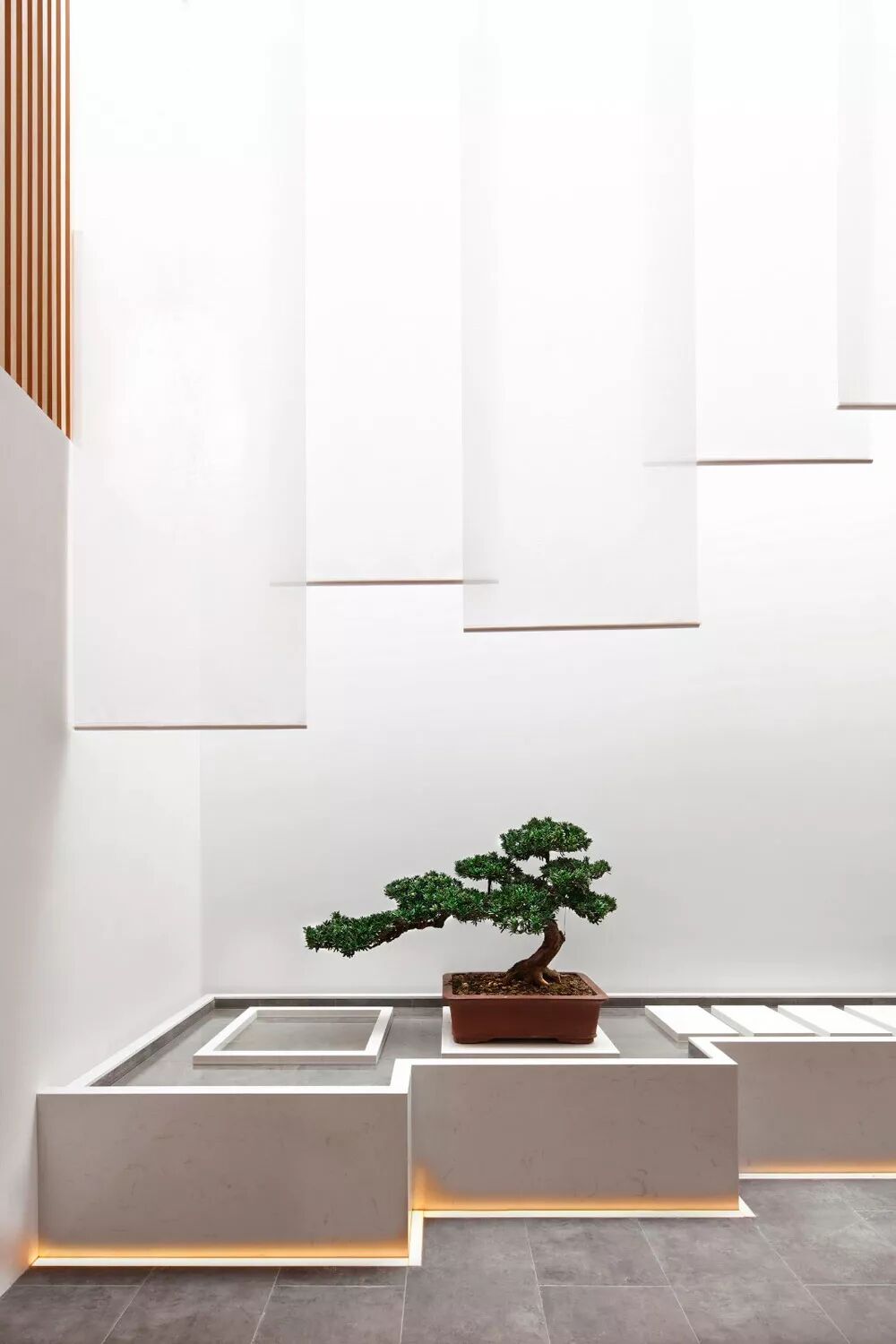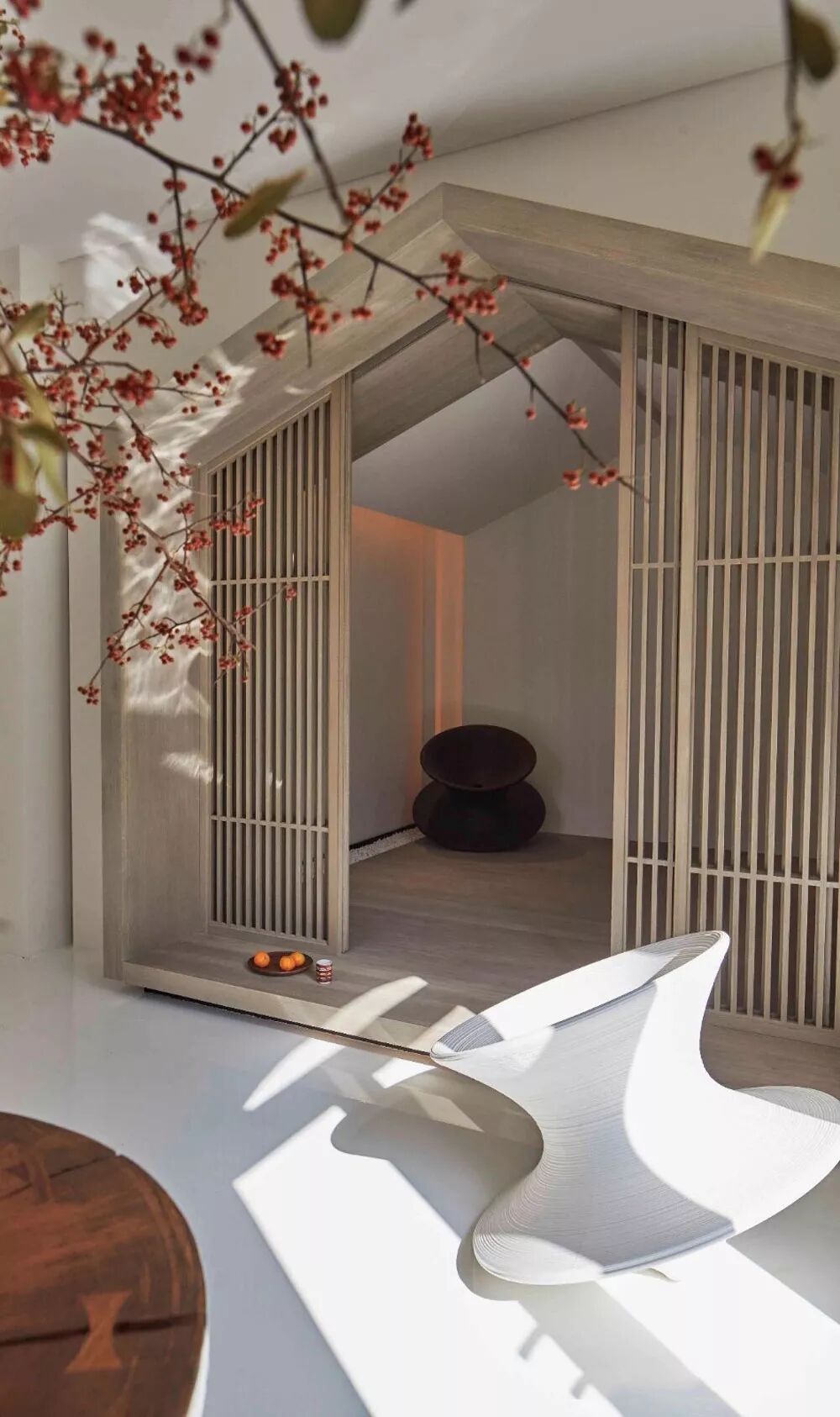 中国文化里讲究留白,但是留白並不代表什么都没有,而是留下充分的想象空间给居住之人。大片的白墙白地砖,穿插着竹子、小景、木桌等传统的中式风格搭配。在现代化的空间里,硬生生的营造出了新中式的极简之美。