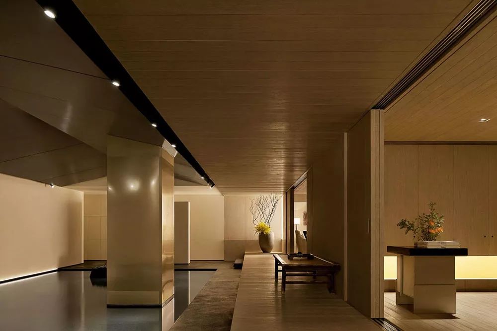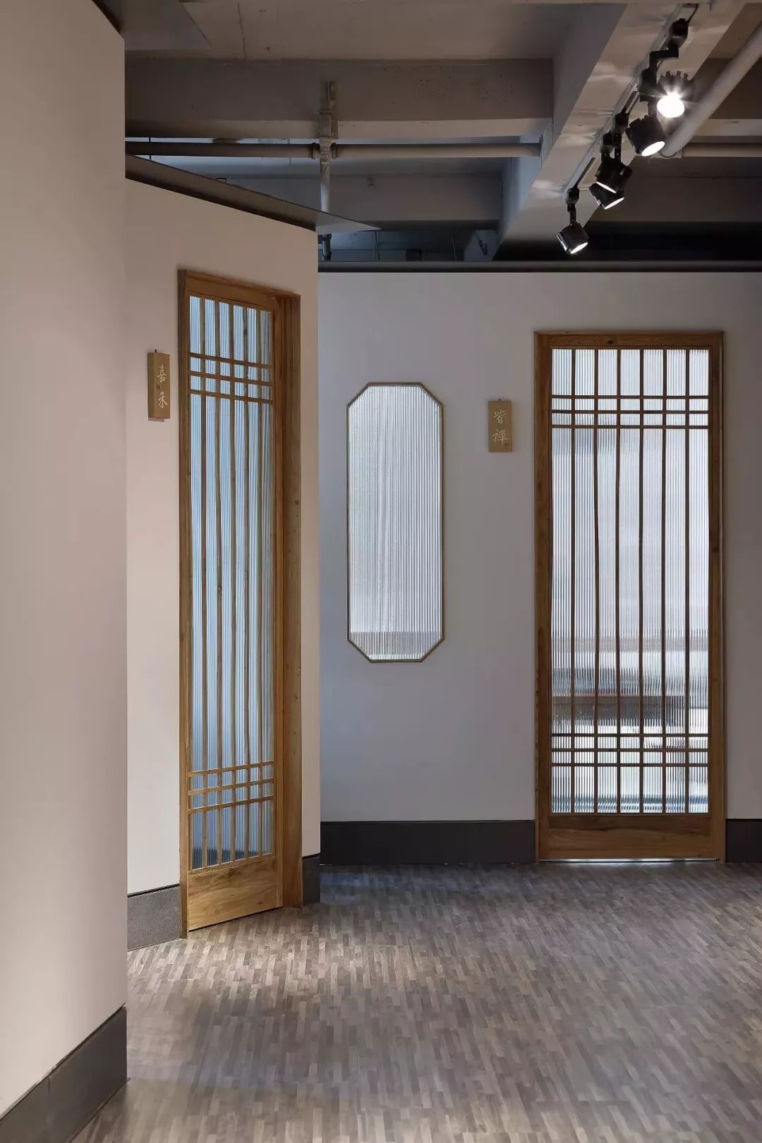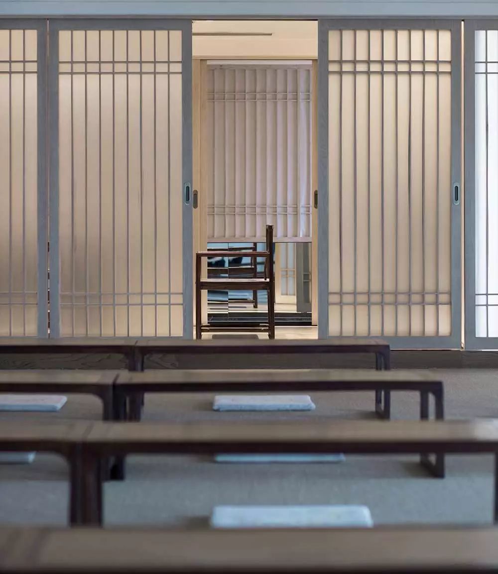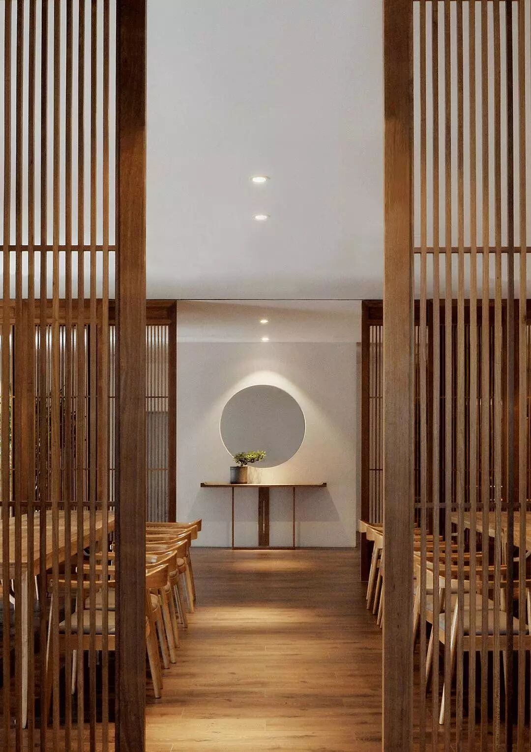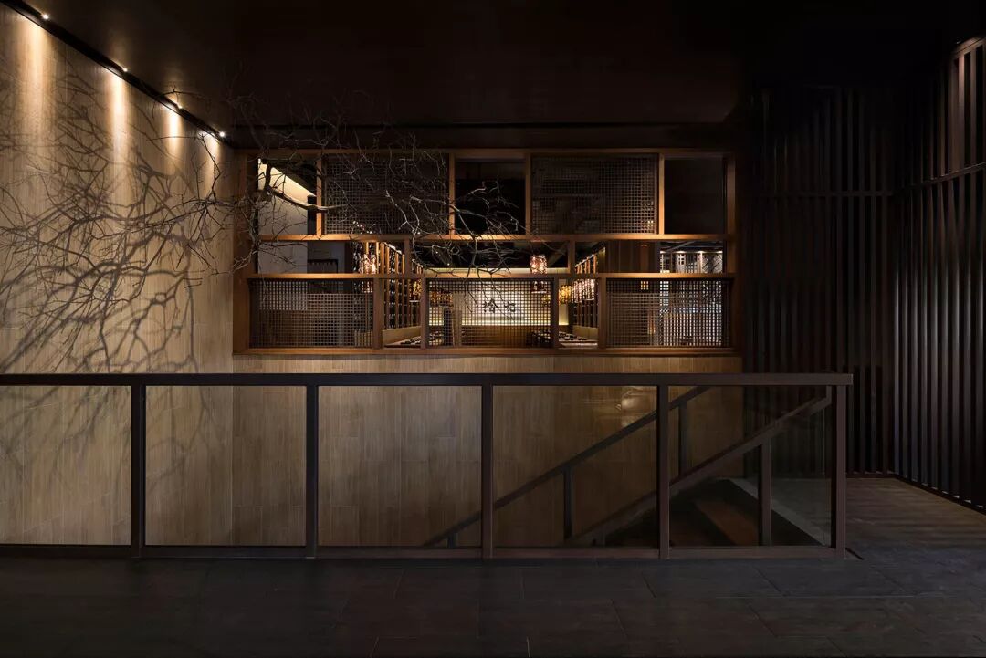 如果说一楼是对日料仪式的致敬,那麽二层就是对实用空间的打造了。沿著线性的灯光,踏阶而上,伴随著左侧千姿态和风人偶的立面,仿佛用一种方式叙述著日式对客人很高的欢迎礼。右侧条型隔栅组成的扶栏结合著光影,客人通过的过程,光影斜射,树影婆娑,刹那间你已是景中之人。