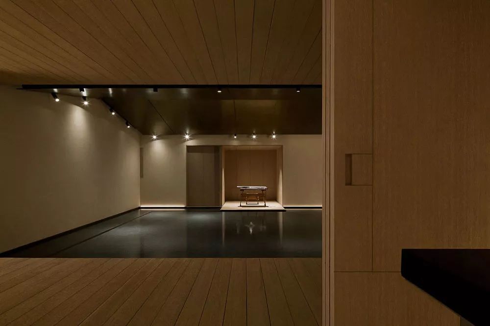 寸土寸金的商业中心一层,只设计了两个功能区:后厨空间和板前空间。在纯正的日料血统中,板前向来是重要的食用佳地,直接连接的后厨保证了新鲜的食材可以很快送至食客面前,新鲜一直是日料非常重要的追求之一。而国内保守低调的生活态度,却让中国消费者常常错过这核心的料理体验方式,相比起板前国人更接受包间或是卡座式的私密性就餐环境。于是设计师创意地,把一层做成一个只有板前的包厢,让每块空间有着似有似无的界限感。