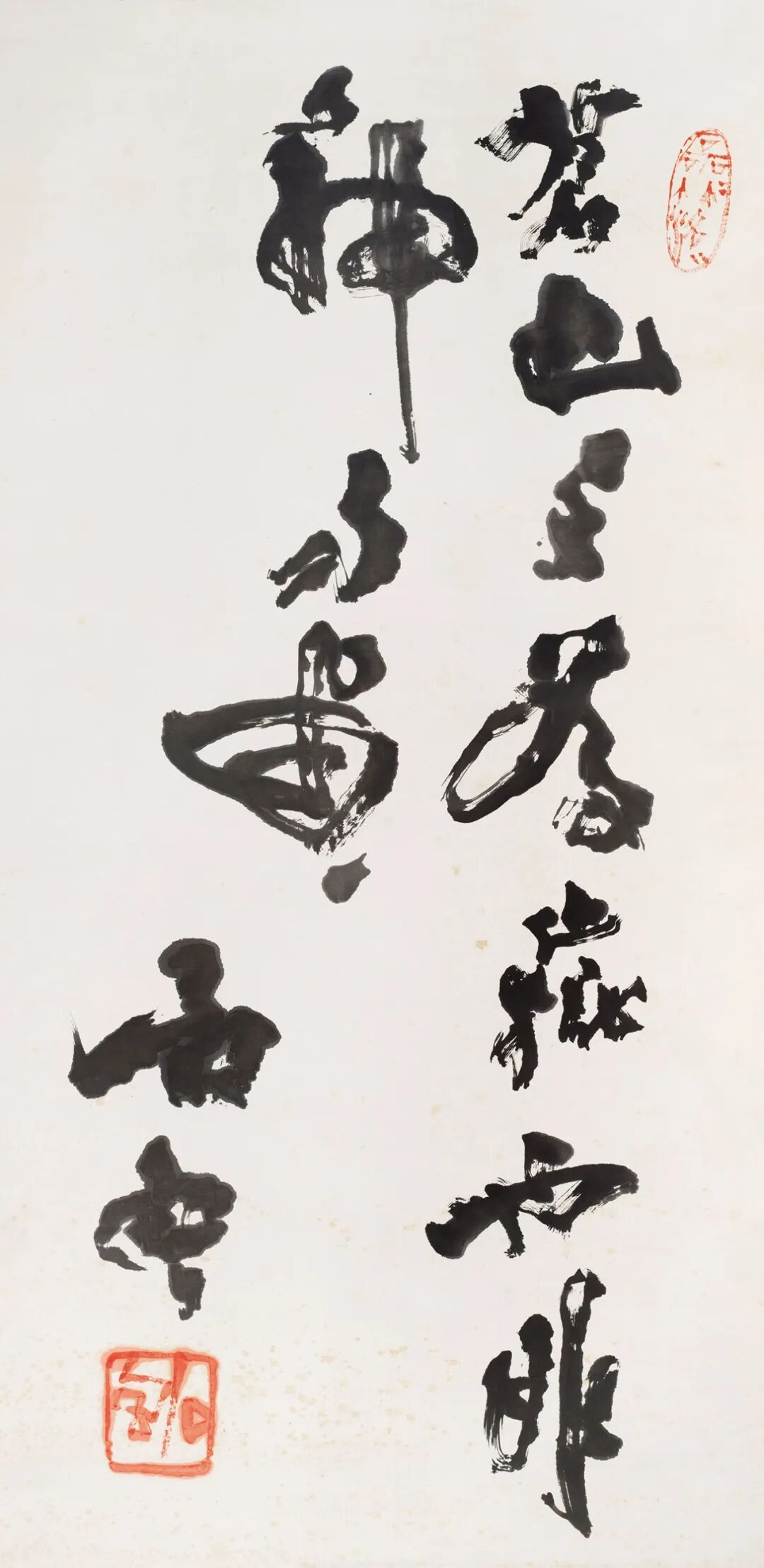 石鲁是中国现代美术史上一位引人注目的人物。他才华横溢,兼通中西绘画,以强烈的创新意识与艺术风骨成为“长安画派”主将。是探索中国画新途的重要力量和最具影响力的国画家之一。作画同时,石鲁同样重视书法,研究各种书体,五十年代后期的书法作品在数量上甚至超过绘画。石鲁的书法不拘成法,敢于独造,风格奇崛刚硬,与之绘画风格的“野、怪、乱、黑”对当时的画坛具有很大的冲击力一样,个人面目突出,异于当时盛行的帖学秀逸文雅的书风。更是与一般书家抄写别人诗句不同,石鲁骨子里的桀骜不训,言 “我文写我心,我书抒我情”,很少蹈用前人旧句。本幅“苍山为岳也,非神勿画”句,常被学人以“石鲁之名言”作文解析,曾被引用为石鲁艺术展的展览主题。观之书,线条忽肥忽瘦,极具节奏,无论肥瘦,都显刚劲之态,富金石之味,行笔间更显笔力,笔力间凸显傲骨,铿锵有声,见其高度。