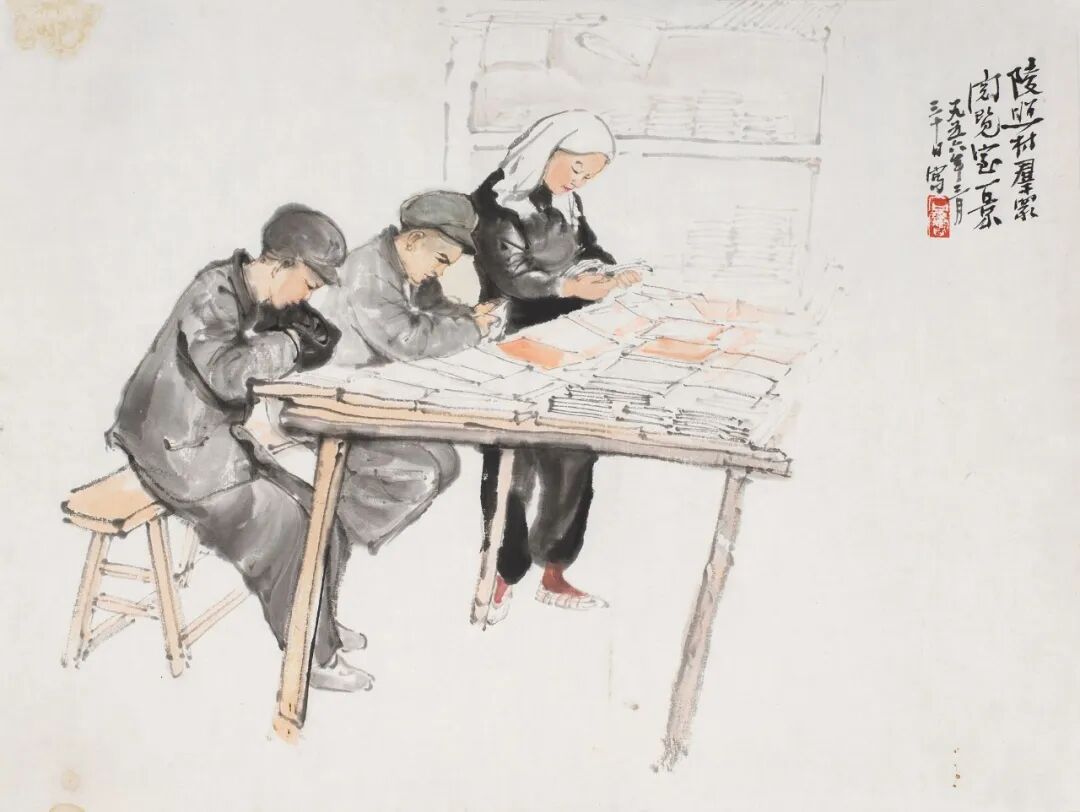 款识:陵照村群众阅览室一角,一九五六年三月三十日写。