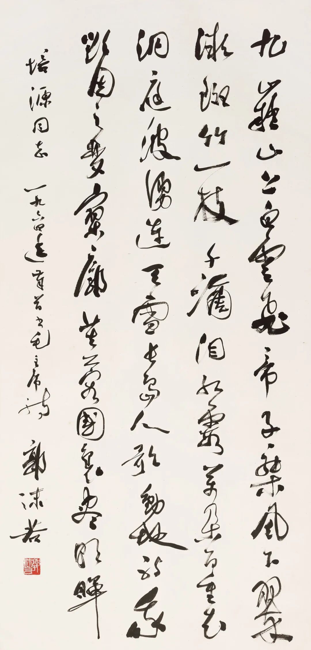 20世纪60年代是郭沫若书法创作的旺盛阶段,郭老常以书法形式书毛泽东诗词,并作有大量的单篇毛泽东诗词书法作品与友人间相赠,一如本幅所书毛泽东诗《七律·答友人》。