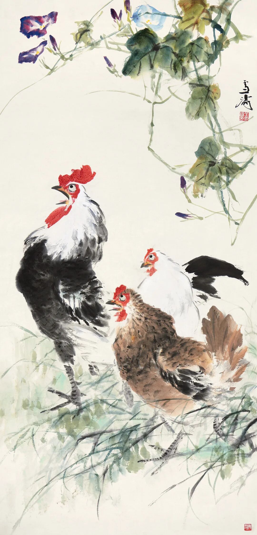 王雪涛的作品,无论是花卉蔬果、鳞甲草虫、飞禽走兽,无论春光、秋风都有一种生命流转的灵动,充盈着自然的、生命的、永恒的意韵。正是这种对瞬间的巧妙把握,总能让观者站在他的作品前久久不能离开。王雪涛,原名庭钧,字晓封,号迟园,1922年考入北平艺术专科学校西画系,后转读国画系,受教于陈师曾、萧谦中、汤定之、王梦白等诸位前辈,尤受王梦白影响最大。1923年同李苦禅一起拜齐白石为师,拜入师门后,齐白石为其更名为“雪涛”。1926 年毕业后留校任教。抗战期间,专事绘画创作生。同时,潜心师传统,上追徐渭、陈淳,又得名师指点,画艺大进。1954年任中国画研究会常务理事,被聘为中央美术学院民族美术研究所副研究员。1955年参加筹备北京中国画院工作,1957年任院画师、院务委员会委员,1978年任北京画院院长。本幅作品正是创作于60年代,笔墨灵巧多变,色墨结合,以色助墨、以墨显色,在传统色中融入西洋画法讲求的色彩规律,以求整体色彩对比协调,为画面增添韵律。在动态中把握家禽形象,刻画细致入微,鲜活多姿,生动可爱,且在情景交融中体现出转瞬即逝的盎然情趣。摆脱了明清花鸟画的僵化程式,创造了清新灵妙,雅俗共赏的鲜明风格。他创立了自己的语言形式,结合“野逸”与“富贵”、“落墨为格”与“以色为重”,主张“师法造化而抒己之情,物我一体,学先人为我所用,不断创新”,对中国花鸟画的发展产生了深远的影响。二十世纪五、六十年代,王雪涛的花鸟画已达到一个艺术高峰,至今无人出其右。