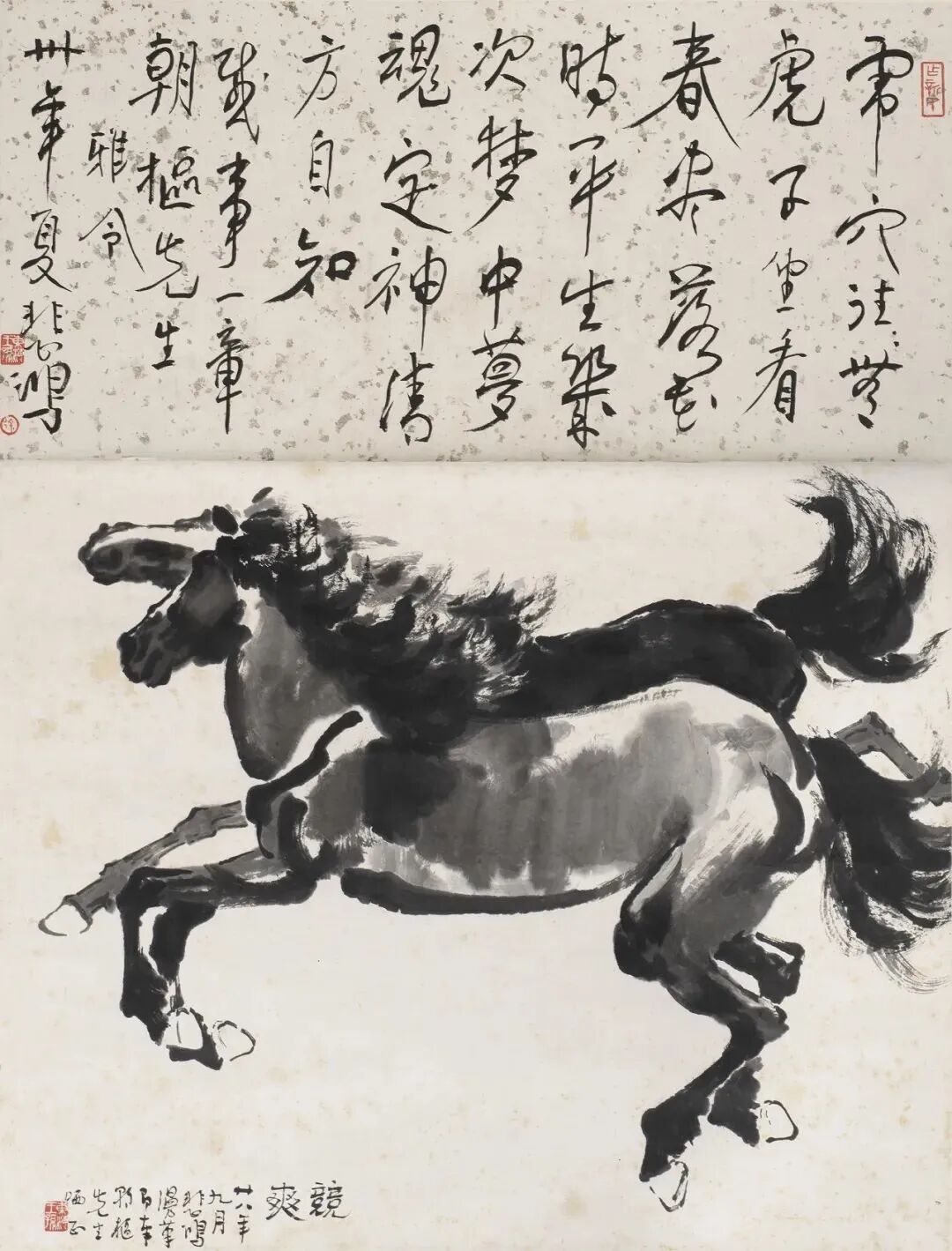 徐悲鸿最擅画马,他的马洋溢着时代的气息。无论是昂首挺立,还是策蹄疾驰;无论是纵情嘶鸣,还是饮水小憩,都予人强健伟岸,活力充沛的印象。徐悲鸿擅画马,基于他少时经常临摹卷烟盒上的动物画。而更为重要的是,马寄托了他的精神和理想——托兴、致力、造诣、自况。他笔下那些狂奔于莽原之上的脱缰野马,孤注一掷,一泻千里,正如他百书不倦的提拔:‘山河百战归民主,铲除崎岖大道平’。徐悲鸿的马超越传统之处在于破格,他打破了传统细笔先勾勒轮廓,继而填色的作画程序,寄情于豪放的线条运用。他的线,恣意有力,粗细并重,浓浅得宜,疏密有致,多姿多态。马腿,以重笔浓墨爽利画出,关节处几下枯笔,再以焦墨细笔勾勒马蹄,使人顿感四蹄生风。尤为精彩的是马鬃与马尾,极富质感与量感,气势洒然,据传是以狼毫油画笔代替毛笔画出。徐悲鸿以勾、点、垛、染等油画笔触技法,严格依据马的物理性征和骨架结构来组织线条,浓淡枯湿、轻重疾徐、疏密聚散,运用之妙,存乎一心。鸿习马的铅笔速写积稿盈千。他所下的每一笔,看似一挥而就,却笔笔到位;每个转瞬即逝的神态,貌似恣情而为,实则为卧薪尝胆的结果。徐悲鸿的马,为中国传统绘画确立了一种新的笔墨语言,并赋予马一种精神力量,几成中国写意马的典范。此帧《竞爽图》作于1939年,时值日军侵华,徐悲鸿身处家悉国难、悲困交加,强烈的民族责任心驱使他辗转于南洋新加坡、吉隆坡、槟城、怡保和印度五地,举办义展,卖画筹款,并将所得全部用于救济祖国难民。上款人朝枢,为吴朝枢先生,曾任中国驻新加坡大使,与徐悲鸿关系密切,给予徐悲鸿很多帮助。