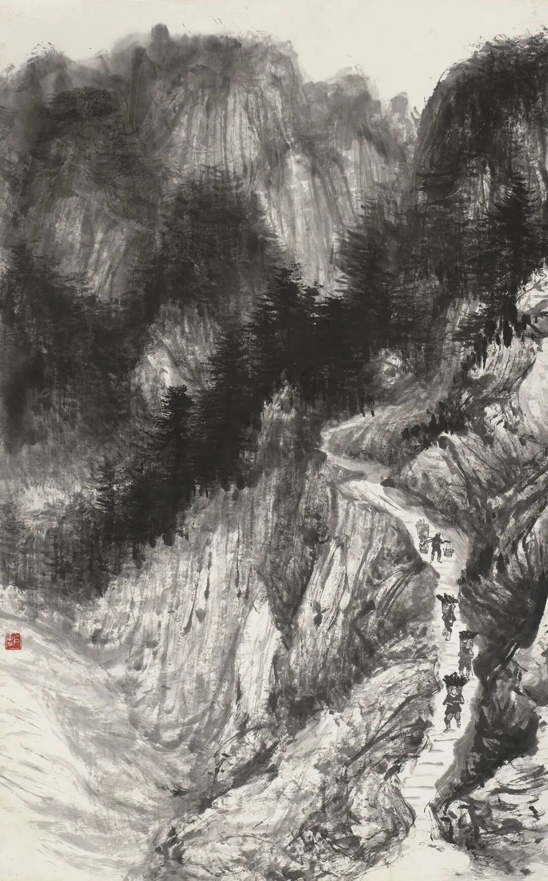 20世纪50年代末60年代初,石鲁的绘画思想趋向传统的回归,相继有一批个人风格成熟的佳作问世。他主张“一手伸向传统,一手伸向生活”,在真实感中发掘生活的美,以情求生活,以生活激起艺术灵感,将浪漫主义的价值理想熔铸到现实主义风格的艺术创作中。作品《深山行旅图》用山水画形式表现劳动人民背柴挑担行路途中的场景。近景山路与远山叠嶂形成鲜明对比,空间的空气感与密茂的山林相互存托,山谷间留白的道路和点缀的人物不仅使画面透气延伸,也点活了山川、秦岭雄伟的自然地貌与人物精神,神形备至。