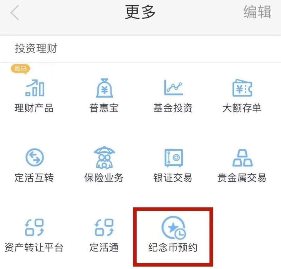 第二步:点击首页的“更多”→在“投资理财”一栏,选择“纪念币预约”。