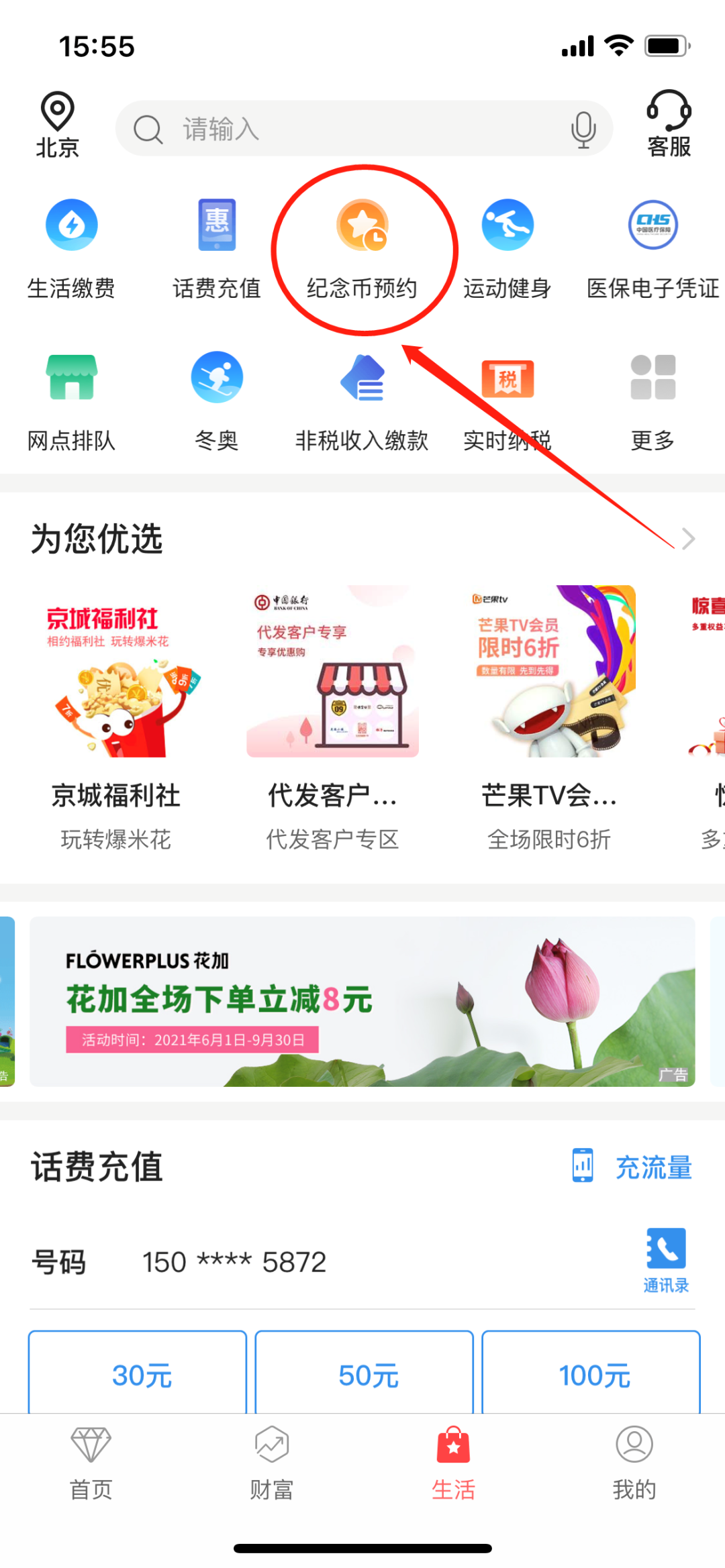 2.下载完成后,打开APP,点击页面下方的菜单栏里的“生活”→再点击上方的“纪念币预约”。