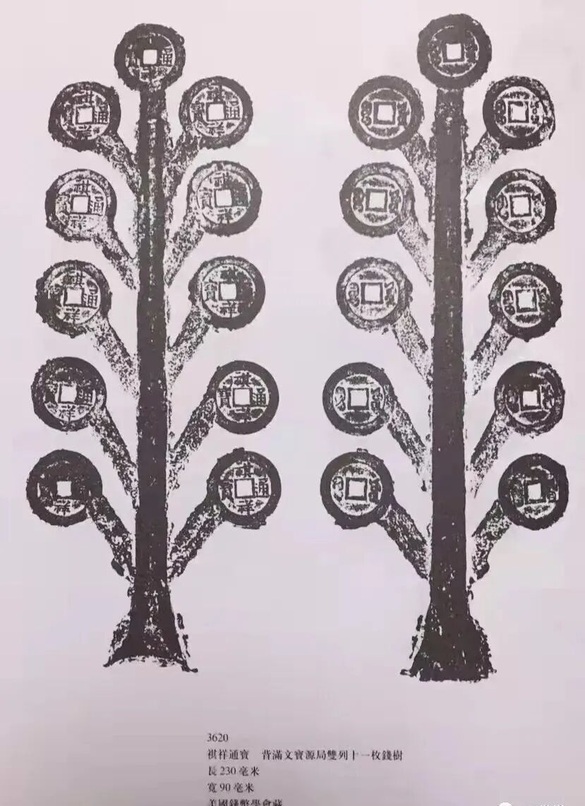 1987年,我移居美国时,曾任美国钱币博物馆东亚部的钱币顾问。有一天,该馆的藏品部主任霍斯顿女士,她邀请我鉴赏了馆中所藏的中国钱币藏品,当我看到在藏品中,竟有清代“祺祥通宝”钱树大小两枝,大枝为“祺祥重宝”当十钱,是宝源局所铸,小枝为“祺祥通宝” 小平钱,是宝泉局所铸。据我所知,“祺祥”年号仅有60余天,故“祺祥”钱流通甚短,销量有限,存世真品极少,那知世上竟尚有“祺祥”钱树存在,可谓十分难得。为此我给父亲写信,说了此事。后来,我父亲回信中告诉了钱树来历,他说:“这两枝‘祺祥’钱树原为我北京老友王希贤的,早年被王守谦买走,后来就不知所踪,从你信中才知道原来是被卖到美国去了……”