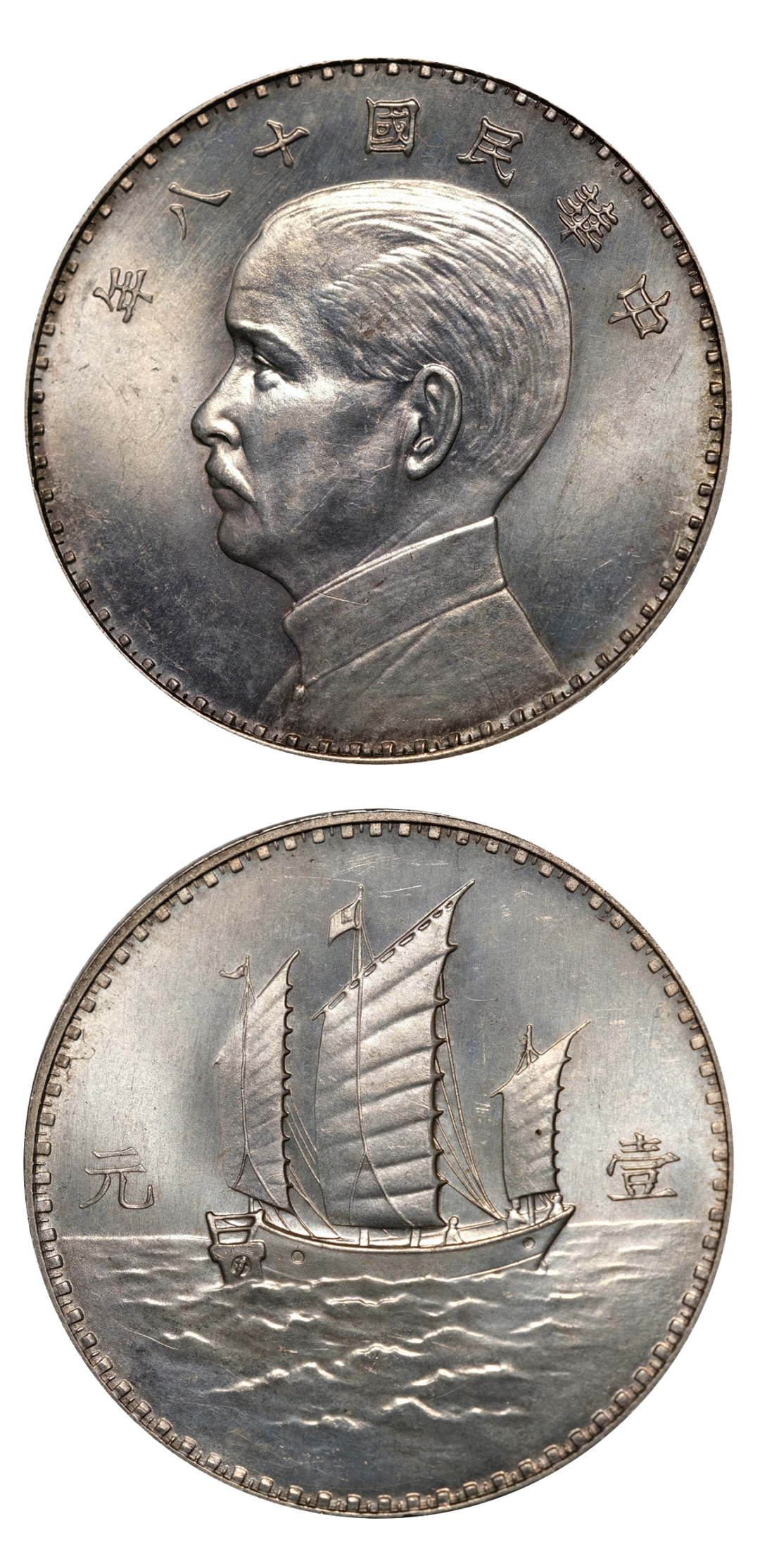 1929年,南京政府研拟新国币铸造方案,同时邀请意大利、奥地利、英国、日本和美国这五个国家的造币厂参与雕刻模具,送样比稿。比稿的目的如同招标,如模具样稿被选中,该国便可向中国出售币模及造币机器,因此,各国争相制作,极尽精工。新币正面设计采用孙中山先生肖像,上镌“中华民国十八年”,背面为三桅帆船,面额“壹元”,习惯称三帆银币。上述五国制作的币模都十分精美,但是均未被采用,仅在杭州造币厂试铸了少许样币,所以此币极为少见,异常珍贵。在此后的十余年中,国民政府多次雕刻试铸“孙像”银币,其间有试铸后便偃旗息鼓者,也有曾大量发行流通者。但民国十八年孙像三帆壹元银币的历史地位、收藏价值始终受人追捧,其已成为这个时期机制币的典范之作。