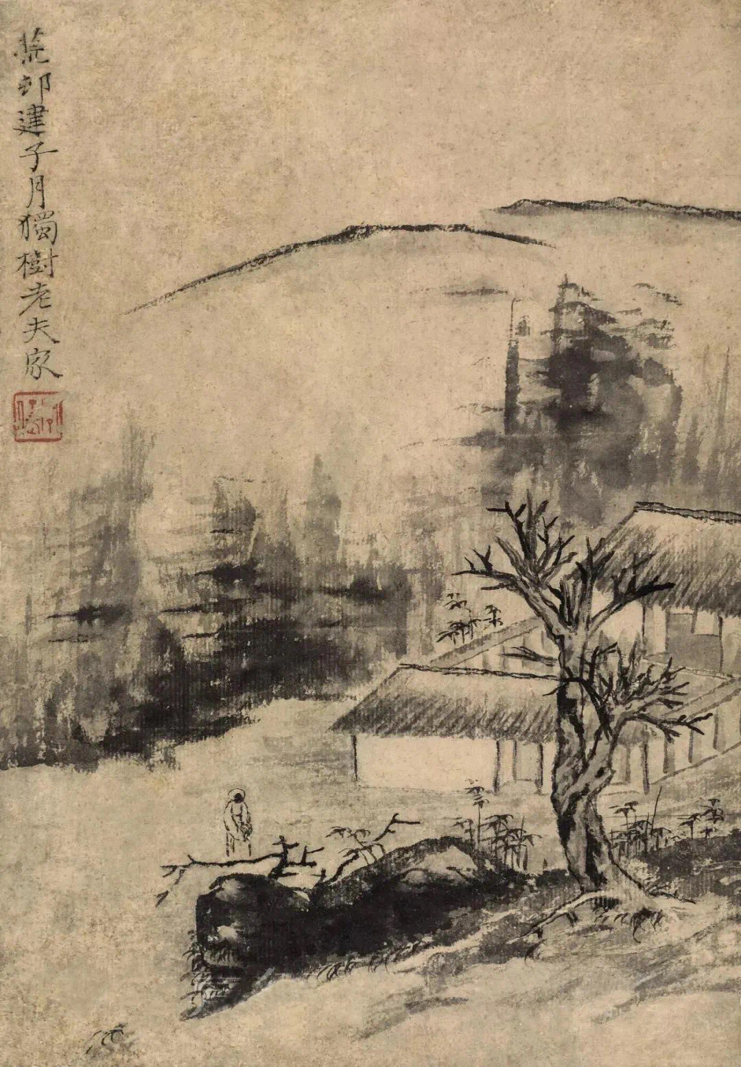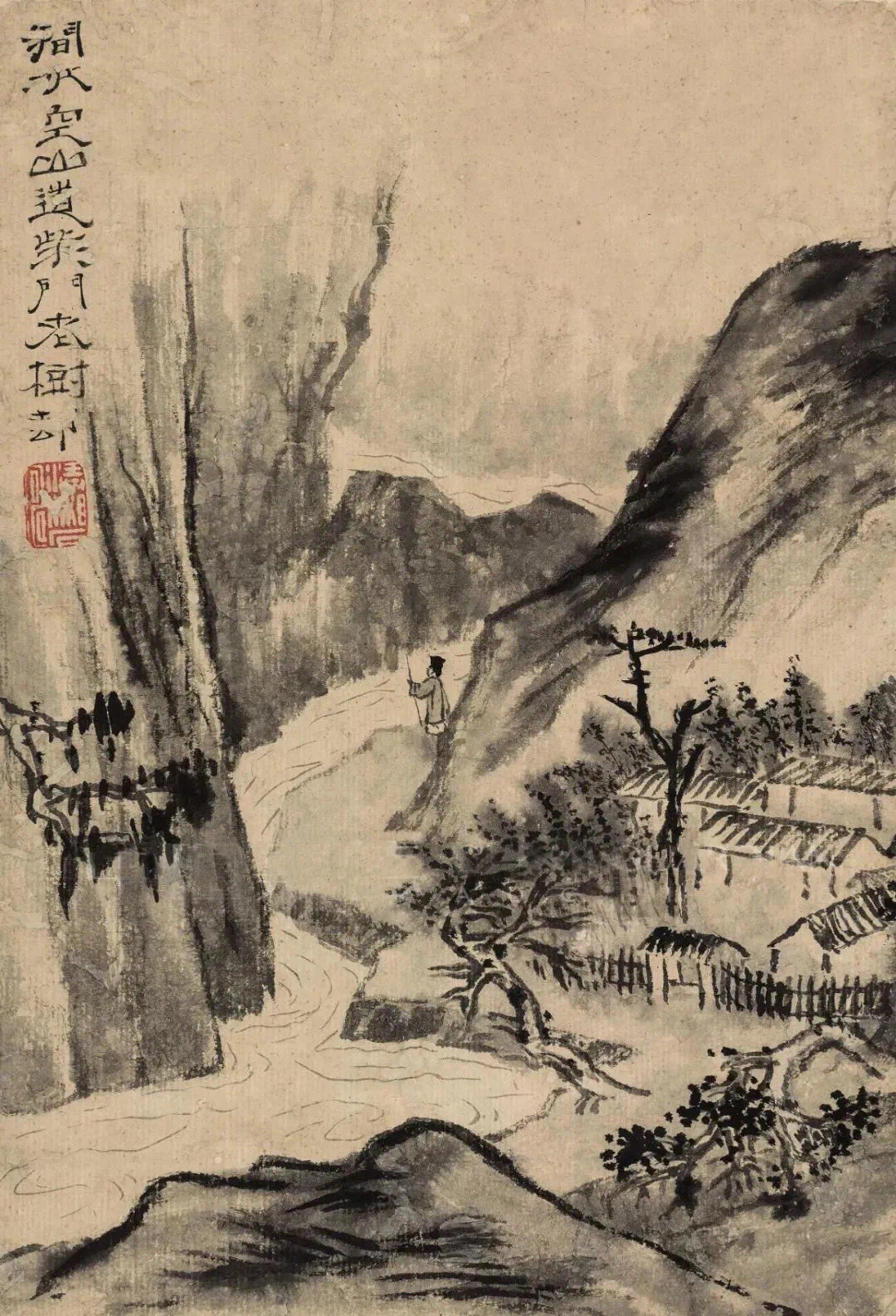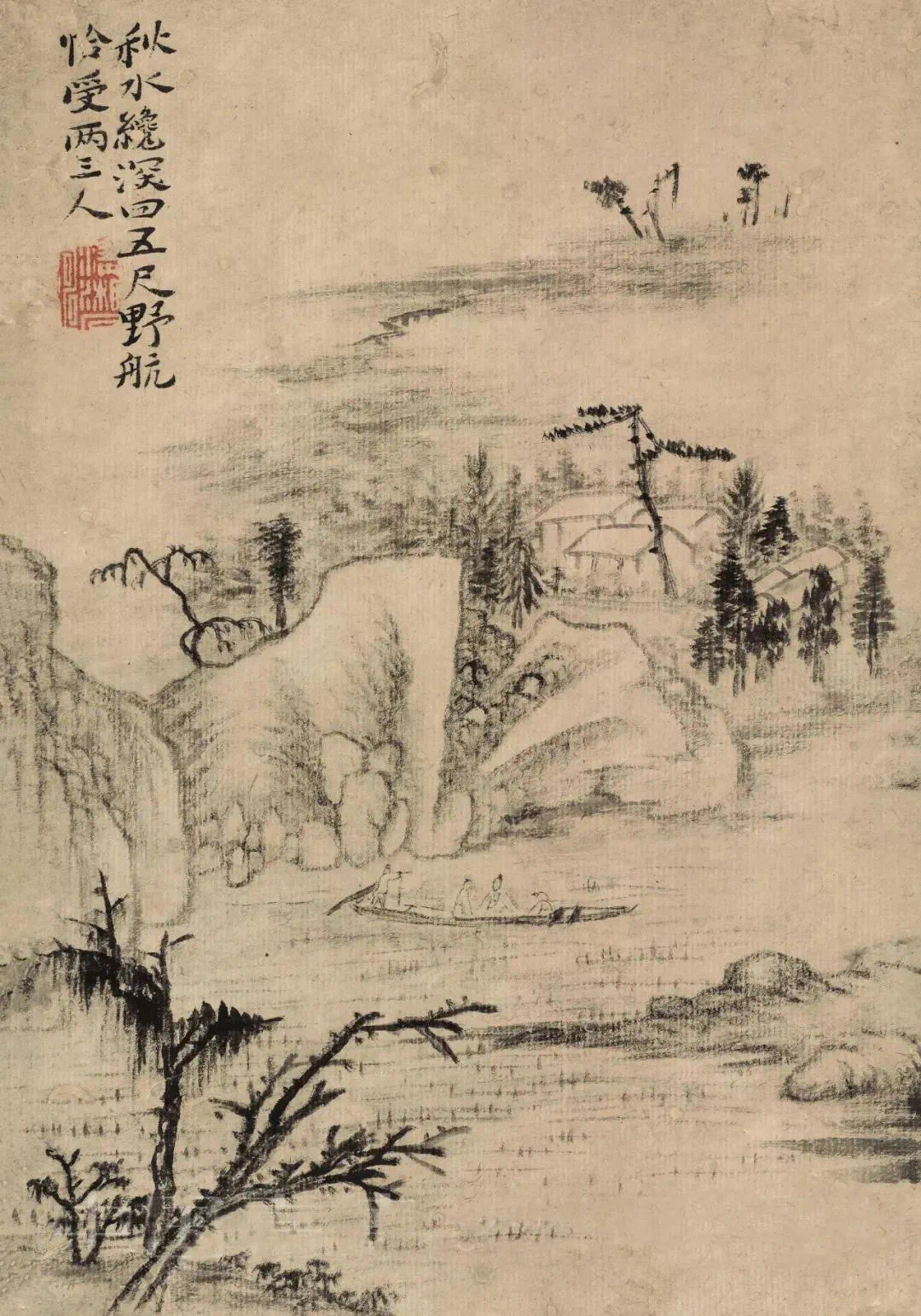 石涛的《杜甫诗意册》用各色不同的立意与笔墨,写出种种活跃着诗的声响韵律若真若幻的山川景象,令人如食橄榄,读之余甘不尽,回味无穷。这组册页用笔得粗重恣肆,而不见率略霸悍之气;用浓墨能透亮,用湿笔不光板;枯而能润,实不碍虚,全册一幅有一幅的境界,一幅有一幅独有的笔墨趣味,是石涛画得极为精彩的一册。