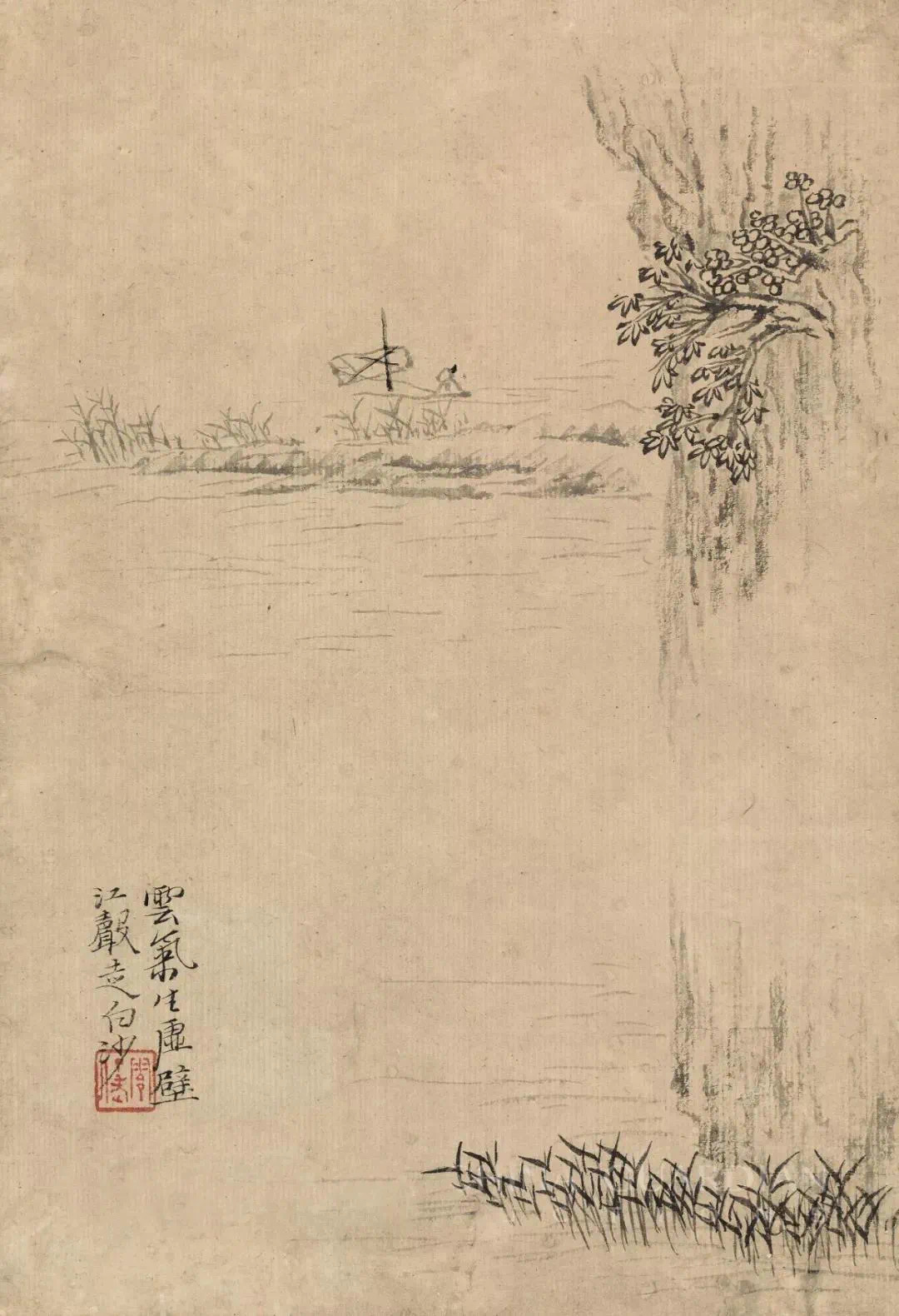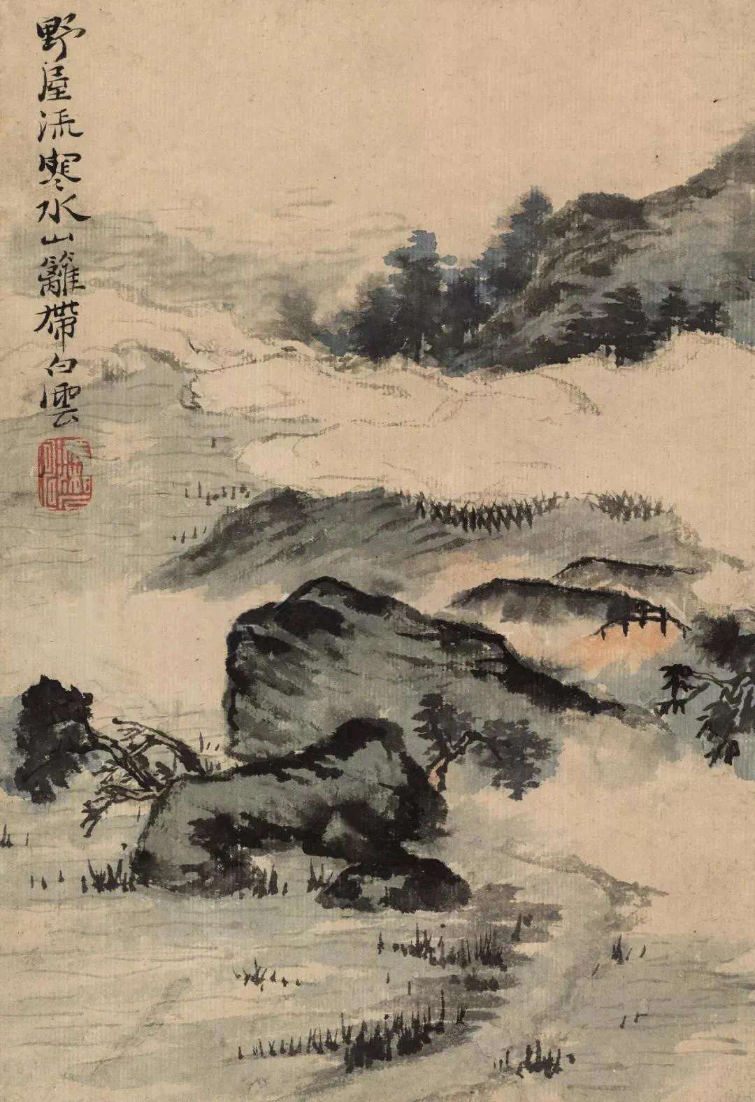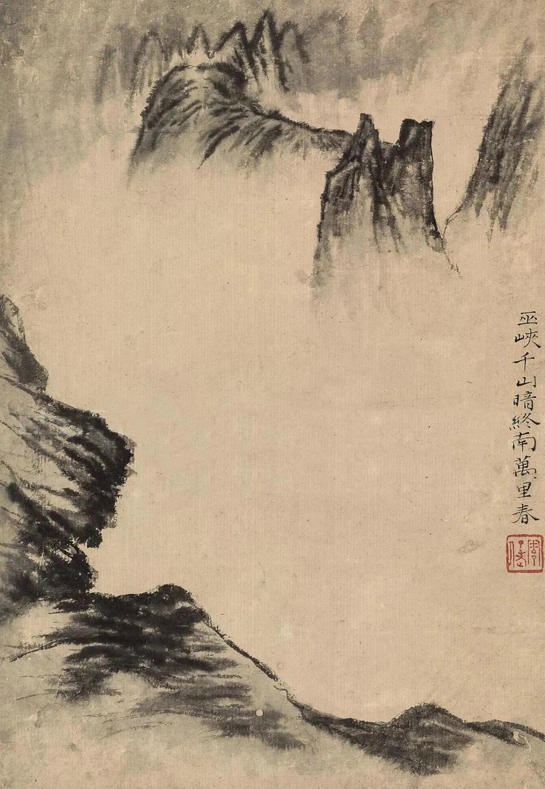石涛的《杜甫诗意册》用各色不同的立意与笔墨,写出种种活跃着诗的声响韵律若真若幻的山川景象,令人如食橄榄,读之余甘不尽,回味无穷。这组册页用笔得粗重恣肆,而不见率略霸悍之气;用浓墨能透亮,用湿笔不光板;枯而能润,实不碍虚,全册一幅有一幅的境界,一幅有一幅独有的笔墨趣味,是石涛画得极为精彩的一册。