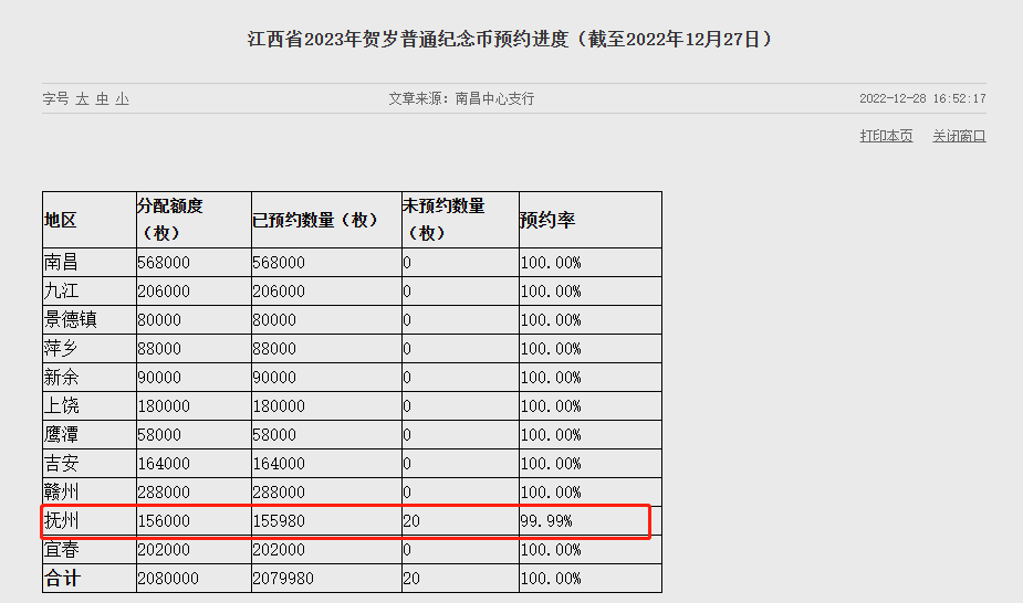 根据南昌分行的公告,截止到27日24时,只有抚州还有20枚未被预约。