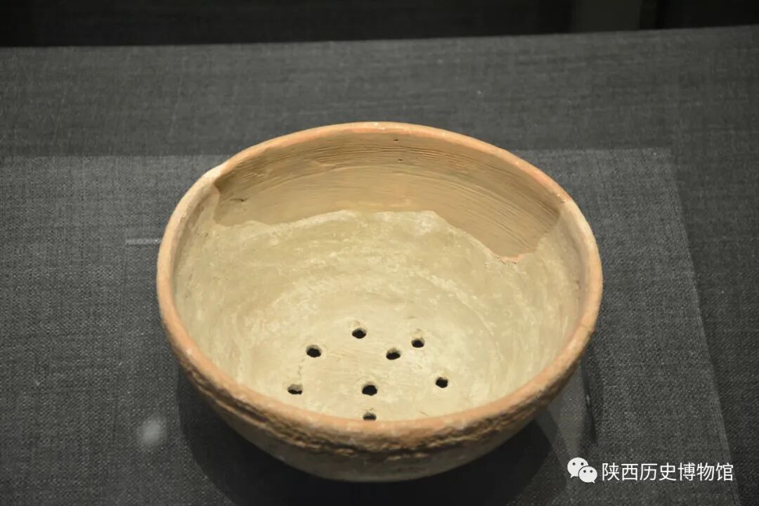 这件陶甑展陈与陕西历史博物馆第一展厅。红陶质地,口大底小,底部有孔。造型简洁,十分接近我们现在家用的盆。
