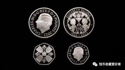 5英镑硬币背面印有两幅伊丽莎白女王肖像,50便士硬币背面的设计则纪念了伊丽莎白女王1953年加冕仪式上佩戴的皇冠,四个盾牌则分别代表英格兰(一株玫瑰)、苏格兰(一株蓟草)、北爱尔兰(一株三叶草)及威尔士(一株韭葱)。