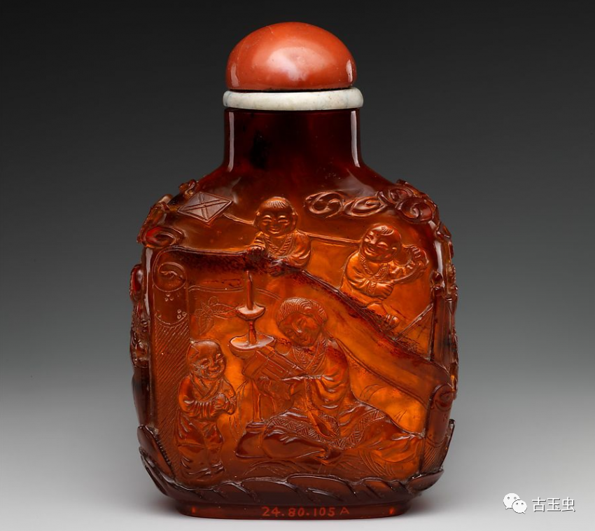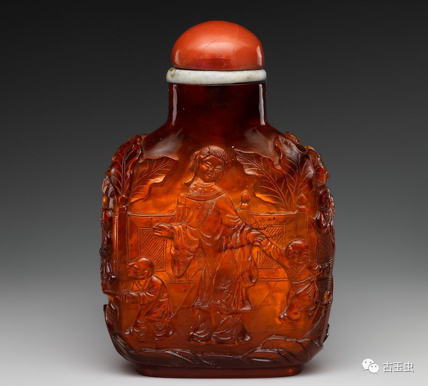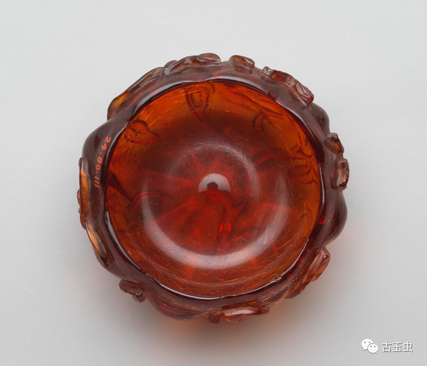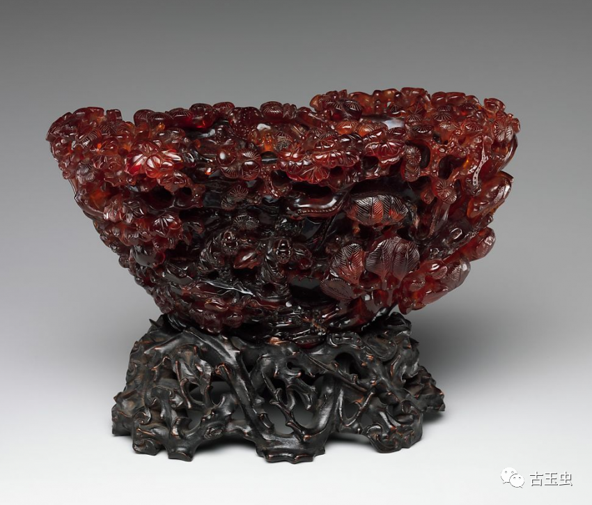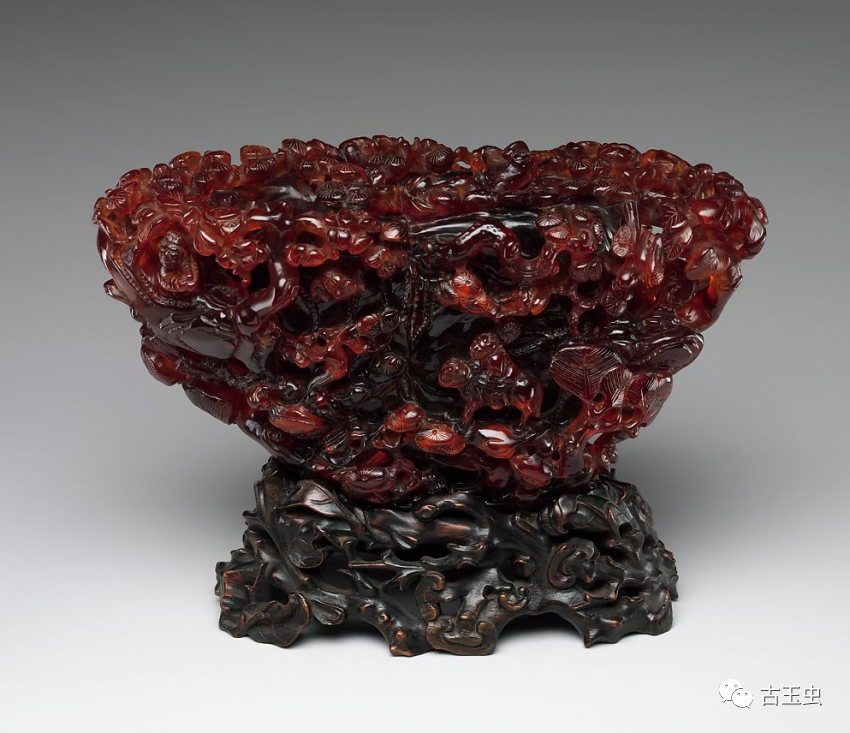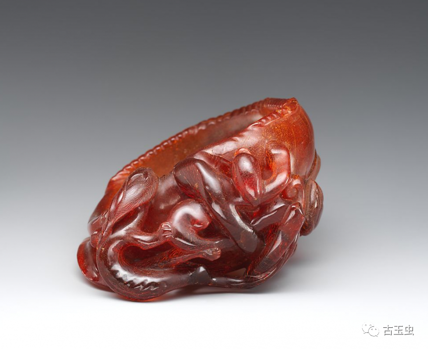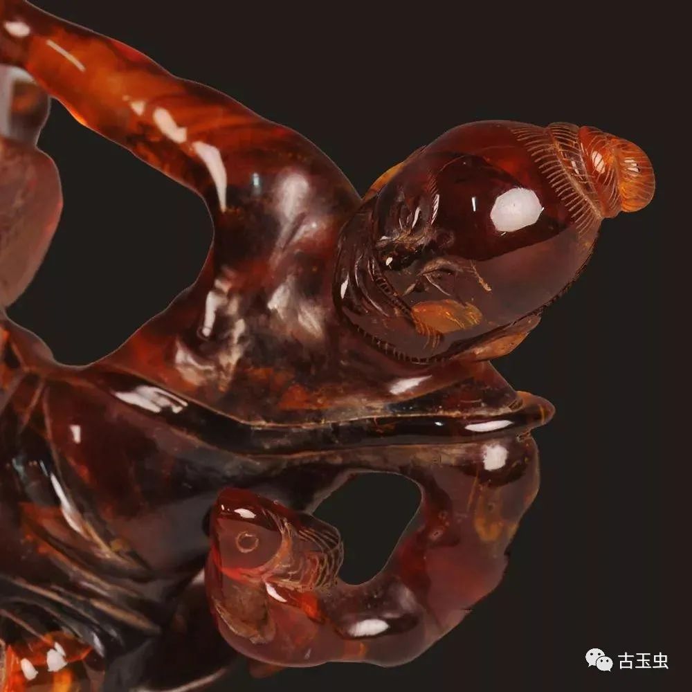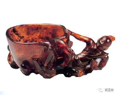 渔翁高挽发髻,双眼直视前方,咧嘴而笑,上身裸露,双臂粗大健壮有力,足蹬高靴,左手紧握一尾鱼,鱼嘴上昂,鱼鳞明晰可数,一副鲜活之态;右手紧抓杯口,全身呈侧倚状,臂膀上肌肉轻轻拱起,似在用力支持。那斜倚的外型,有力的身躯,生动的表情,灵活的腿脚,凝聚着勃勃的生机与生机,显示出激烈的动态美。值得注意的是,斜倚着的渔翁不仅是全器的传神的地方,并且是作为琥珀杯的把手来运用的,这更令人不得不佩服创作者绝妙的构思了。这件琥珀杯的资料之美、构思之精、人物之传神、雕刻之工致,都是同期间著作中前所未见的,充分体现了刀法简练、圆润、落拓不羁的明代圆雕技艺。