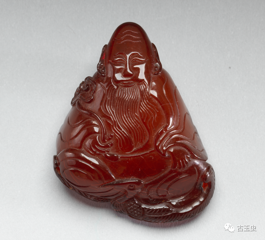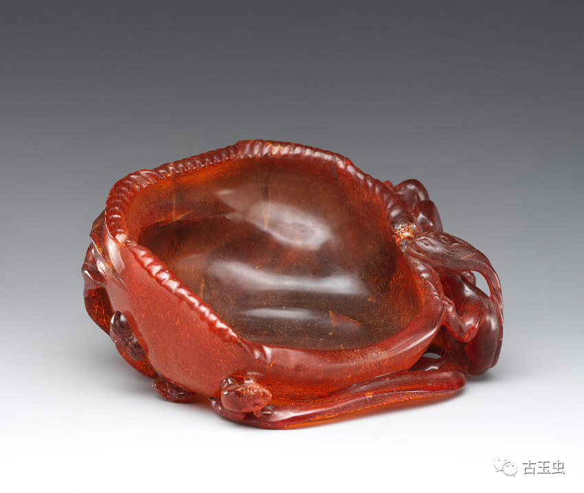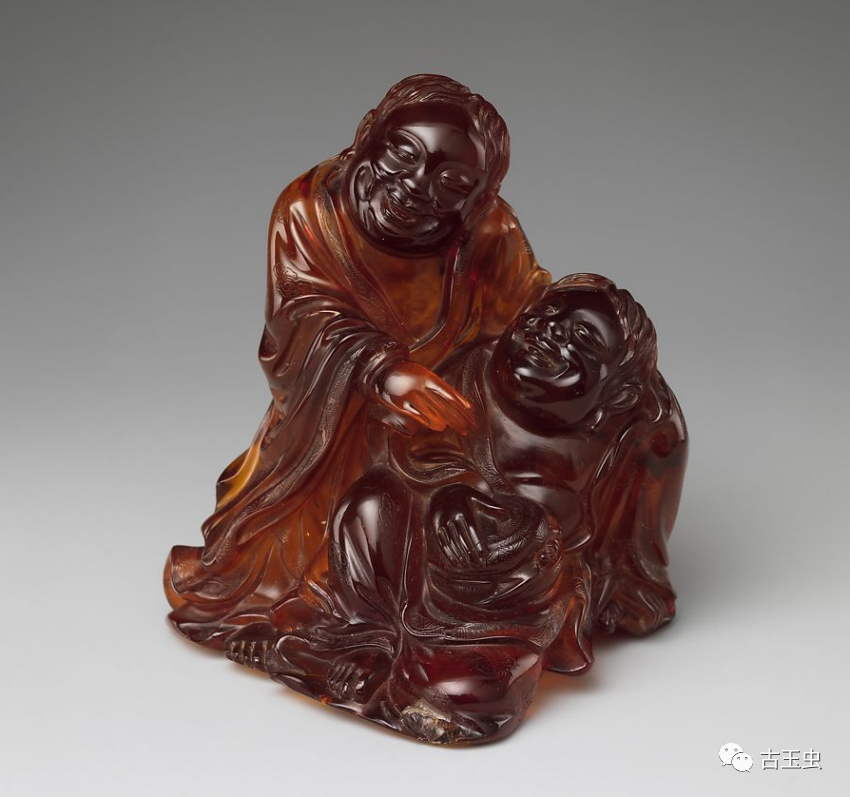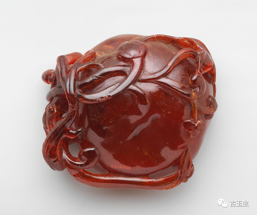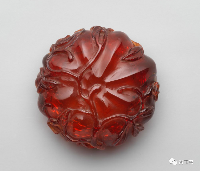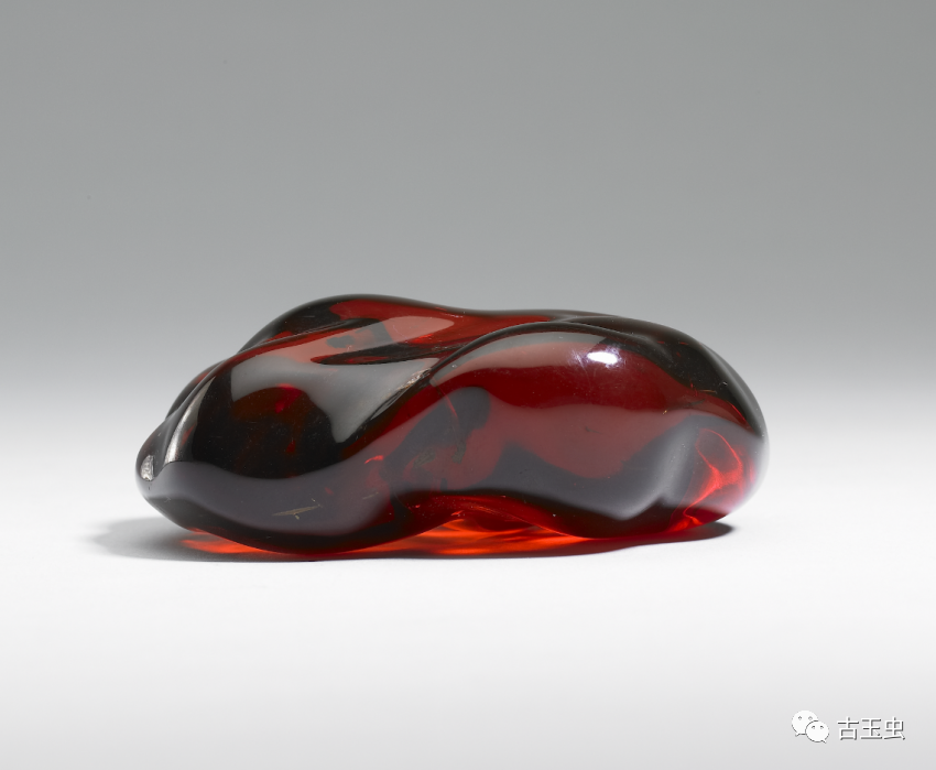 琥珀是地质历史上的树脂经过石化作用的产物,被称为“树脂化石”。具有非常美丽的典型的树脂光泽,有的是珍珠光泽,透明或半透明。质优者常用作玉雕材料,最上品称血珀,作赤红色。明代宋应星《天工开物》记载:“琥珀最贵者瑿(音依,此值黄金五倍价),红而微带黑。然昼见则黑,灯光下则红甚也”。这两件琥珀饰均以血珀雕成,质工俱佳,十分珍贵。