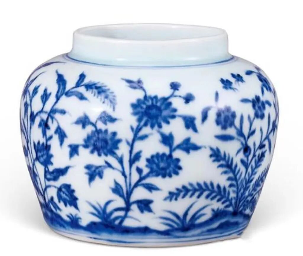 此罐直口,短颈,丰肩,扁圆腹,圈足。器以青花绘菊花、石竹等盛开的花卉,间绘蝴蝶翩跹翻飞,摇曵飘香,为成化早期御窑瓷器。
