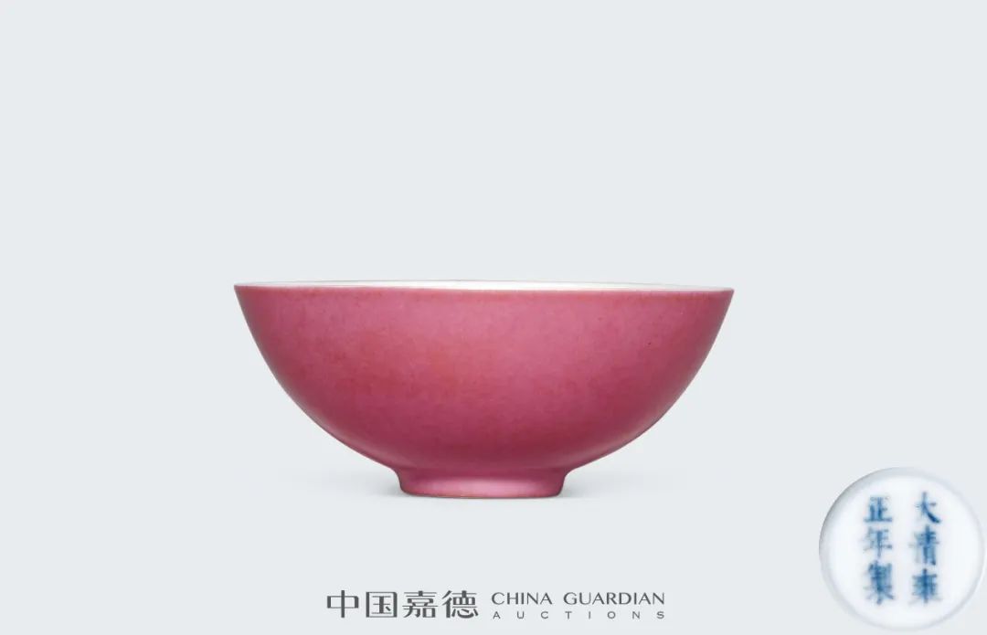 杯内壁施滋润白釉,上以洋彩绘瓜子、葡萄、香瓜等各式瑞果,色泽靓丽,寓意吉祥。外底心青花单圈内书“大清雍正年制”六字双行楷书款。胭脂红釉因颇如女子化妆的胭脂之色,故而得名,成交价:RMB 3,795,000。