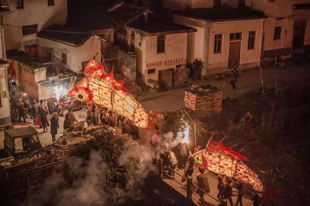 邂逅古村,看大红灯笼高高挂,观舞鱼灯、打食桃、品锡格子茶、贴春联。