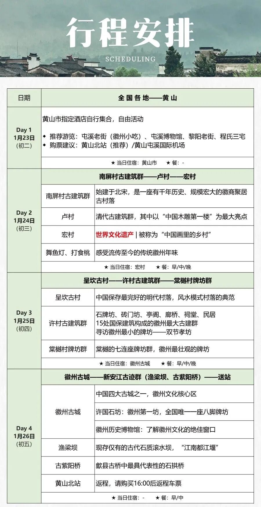 精选最具代表性的徽州古村落,世界文化遗产——宏村、风水模式村落的典范——呈坎、15处国保建筑的徽州最大古建群——许村、徽文化发源地的——徽州古城.....