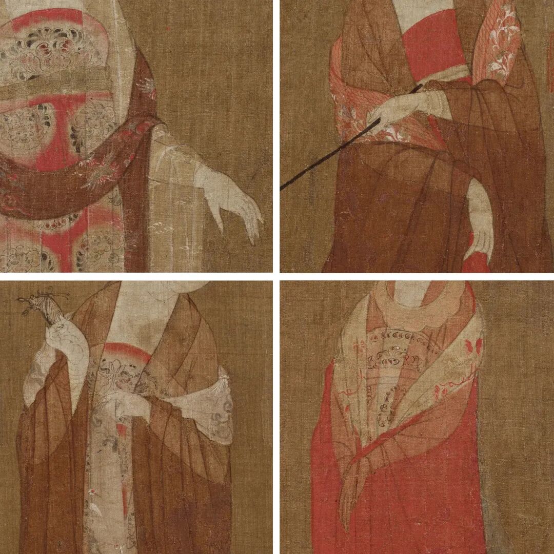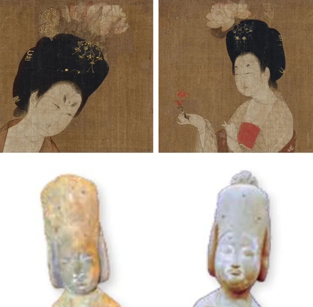 二、画中妇人的打扮、装束与陆游《南唐书》记载后主李煜的大周后“创为高髻纤裳首翘鬓朵之妆”相印证;三、画中妇人着纱衣而又有盛开的辛夷花做配景,这显示了江南独特的风光物候。▲《簪花仕女图》中仕女发型与南唐二陵出土女俑发型比照