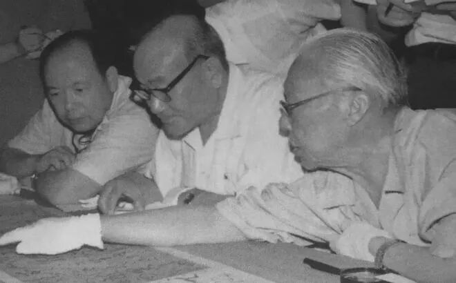 ▲ 谢稚柳、刘九庵、傅熹年(从右至左)在辽宁鉴定书画