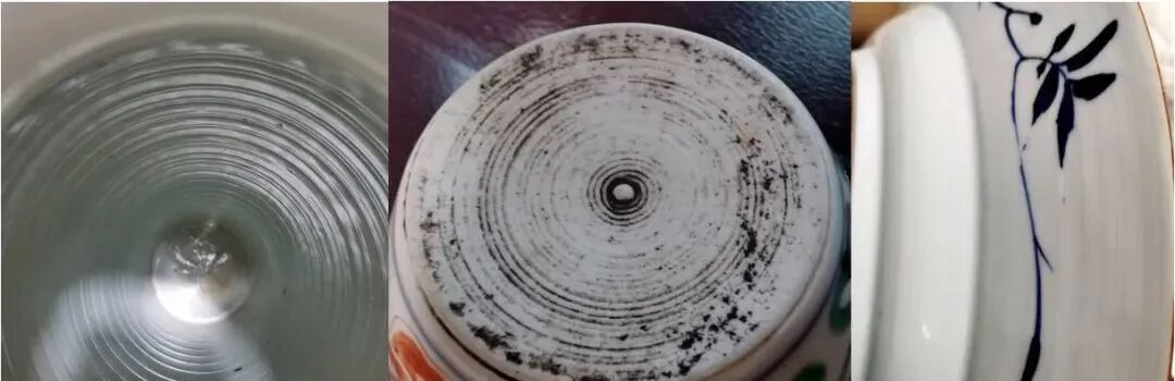 7:旋纹。器物底部旋切和拉坯留下的螺旋纹痕迹。历朝历代生产的陶瓷器都有。或舒朗或紧密,旋纹间隔不同、粗细不同,而反映出来的相对年代也会不同。旋纹的特征是根据当时的转轮速度和拉坯、旋切的速率而定。旋纹一般都在无釉的胎上面比较常见,但有些旋纹在釉下还可见到。基本的的判断是旋纹间隔越粗,说明转轮速度越慢,从技术角度上来说是年代相对远一些,反之机械转动越快说明技术更成熟,到现在电动马达转速就更快、更稳定,出现的旋纹就更细密紧致。从仿品角度上来观察,晚清很多仿前朝的大瓶大罐都故意做出很宽很深的旋纹来冒充前朝器物,我们可以留意观察。