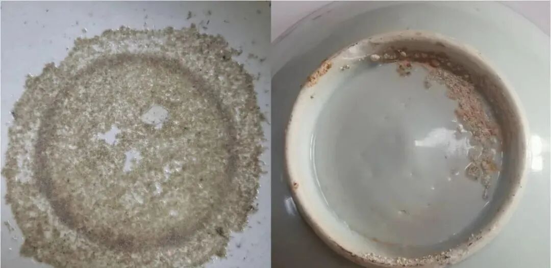 5:米糊底 。米糊底也是早明时期瓷器上常见的一个工艺特征(多见于大盘),由于垫烧工艺使得垫烧材料粘附在了器物底部,出现了一种类似烧糊的现象。这是比较典型的工艺“缺点”。米糊底多见于永宣无釉的毛底器物,一直到明代中期还可见,但色泽和直观已经有了很大的区别。清代一朝由于烧制工艺的改进,所烧器物没有见到有米糊底现象,到了现代才有仿制米糊底作假。但判断相对比较容易,不是没有芝麻状颗粒感就是斑驳成片,红的别扭。