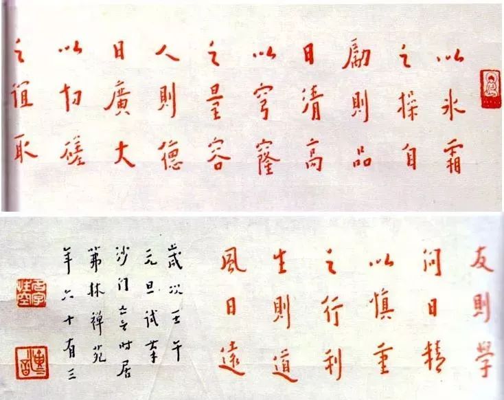 释文:以冰霜之操自励则品日清高 以穹窿之量容人则德日广大 以切磋之谊取友则学问日精 以慎重之行利生则道风日远 岁次壬午元旦试笔 沙门亡言时居茀林禅苑 年六十有三
