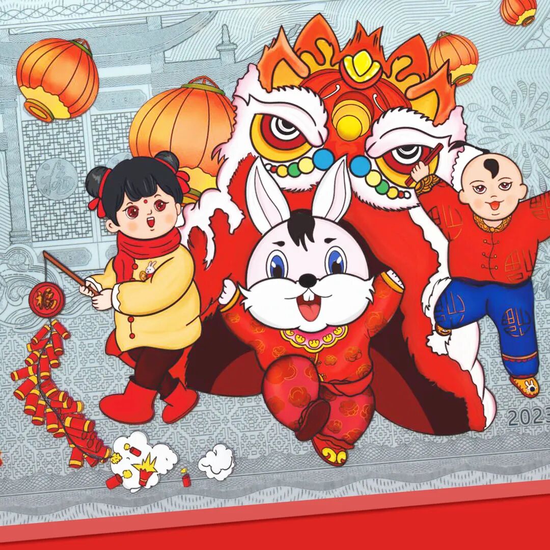 正面选用了国潮元素,小兔子舞狮的场景活灵活现,整体氛围吉祥喜庆,运用了咱们喜闻乐见的春节元素,例如红灯笼,鞭炮,福字等,展现了小兔子活泼乱跳,生龙活虎的场面。钞文部分的设计以院门场景为主体,两个孩童都穿着喜庆的新年服饰放着鞭炮,配着传统特色的灯笼,家家户户都张灯结彩,喜庆热闹、年味十足!