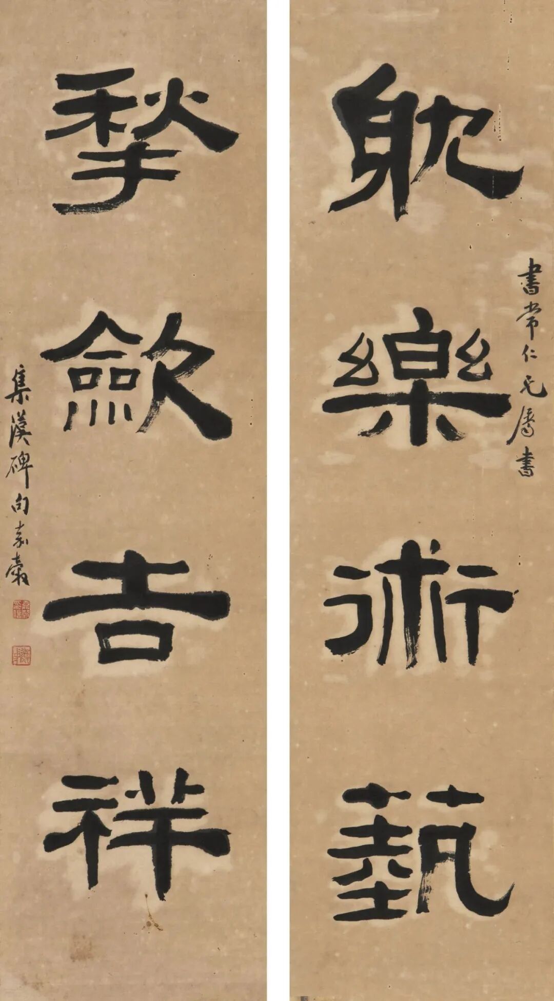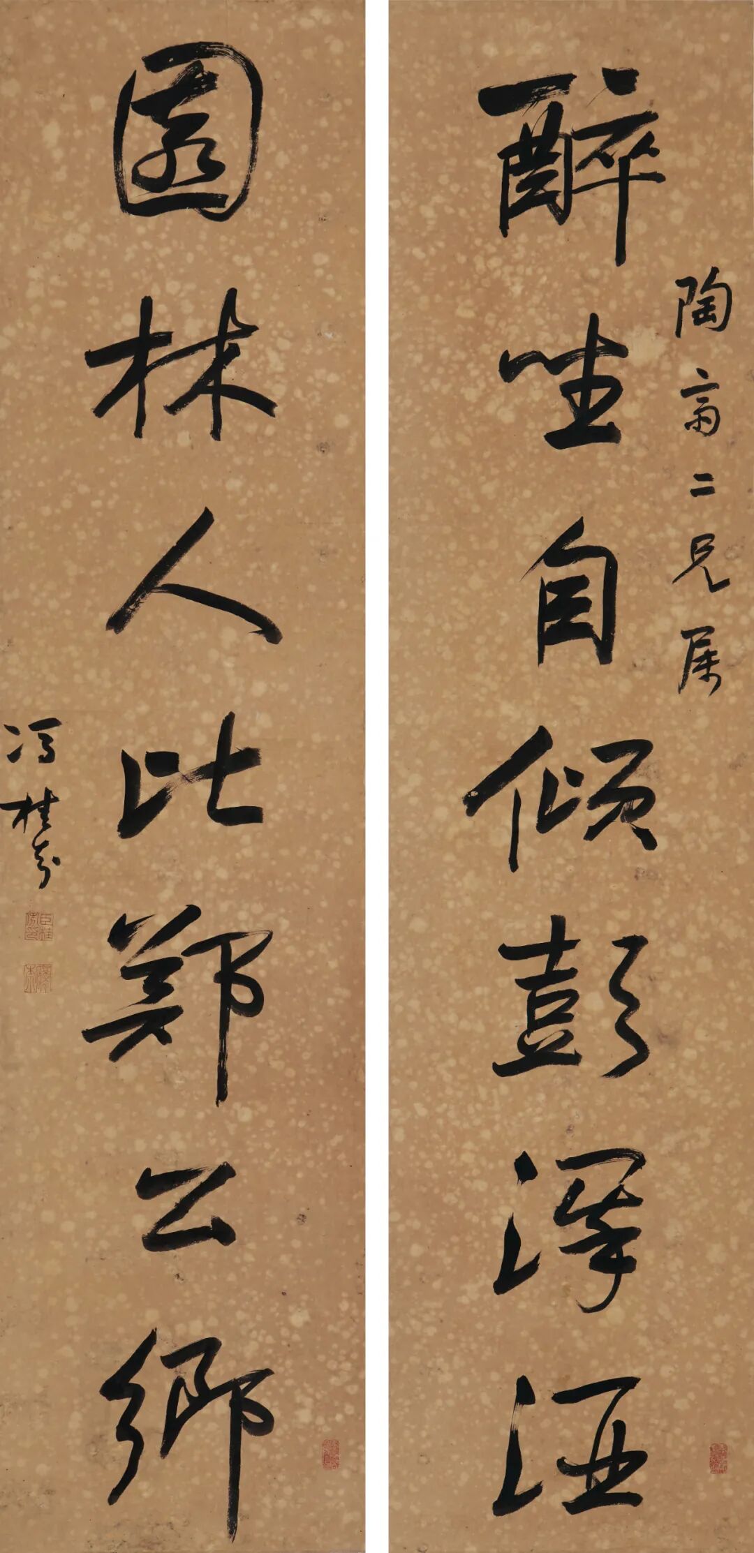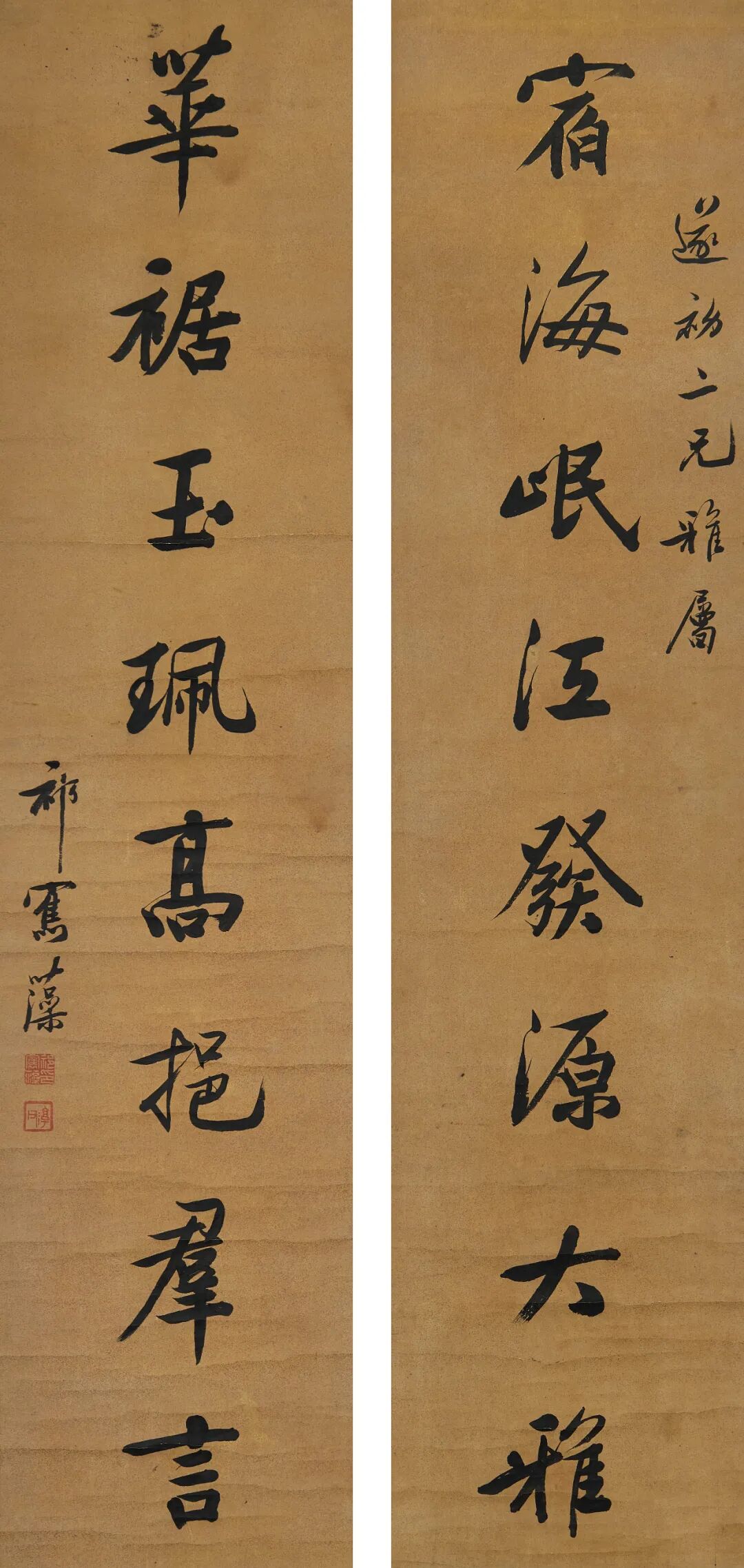 喧闹赋衰老。况蒙霈泽垂,粮粒或自保。妻孥隔军垒,拨弃不拟道。尺寸:129×25cm×2,约 2.9 平尺 / 张款识:集宋句,书为月亭大兄大人正。瓶泉居士林则徐。尺 寸:127×30cm×2,约 3.4 平尺 / 张款识:子久好书工诗,集八字贻之且志别。辛