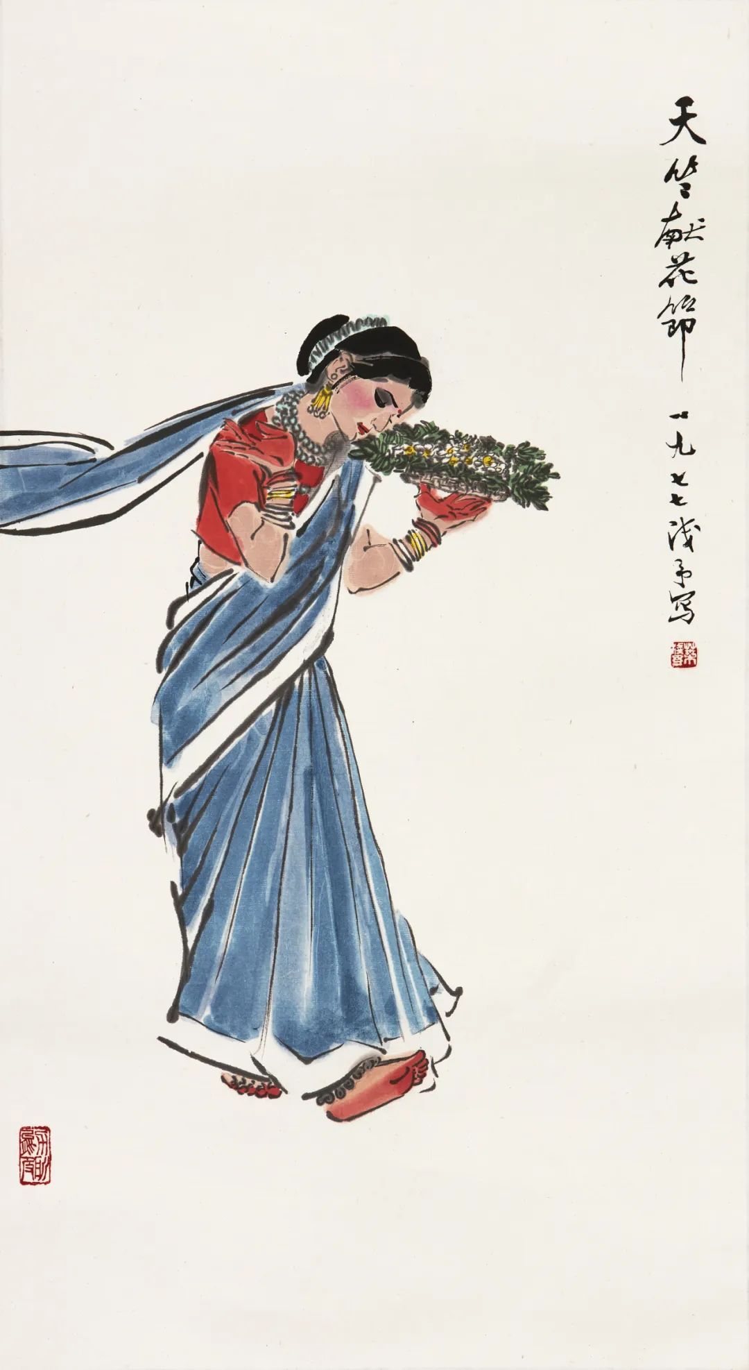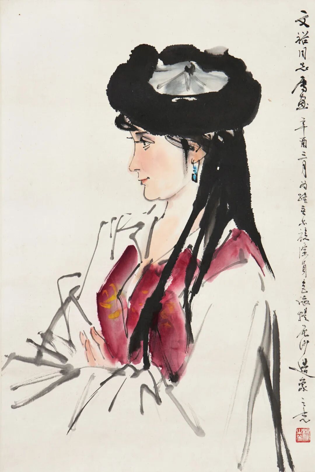 毕业于北京工艺美术学校。曾在故宫博物院学习深造中国古代名画绘画技法,作品《清明上河图》收藏于中国历史博物馆,北京钓鱼台国宾馆。此卷为设色绢本,是作者任丽达用长达一年的时间精心绘制完成,其过程之艰巨可以想见。古人原作是没有设色的,所以此卷的人物设色也是作者多年在故宫临摹古人名迹的经验和功力所聚。所用的颜料均为故宫提供的矿物颜料,描金也是纯金,即在当年也是价值不菲,一般学画者亦很难具备这样的条件。所用的时间之长,付出的精力之大,花费的材料之贵,益显此卷价值之不凡。款识:文裕同志属画。辛酉三月,为维吾尔族演员色依提尼纱造象。之光。备注:Lot70-72为同一藏家,作品直接得自上款人及藏者家属。此幅为杨之光老师于1981年为维吾尔族演员色依提尼纱的造像。画中人物无论衣着、服饰、发型,皆符合维吾尔族特点,而人物的表情、五官、神态,又切合其演员的职业形象,眼神清澈如水正视前方,显得如此自信大方又端庄。表达出了维吾尔族女演员特有的美丽与不同的气韵,给人风情万种的感觉。拍品估价:100,000 - 120,000 人民币款识(1):远看疑画,近看似诗。及至身到其间,又觉诗画都无
