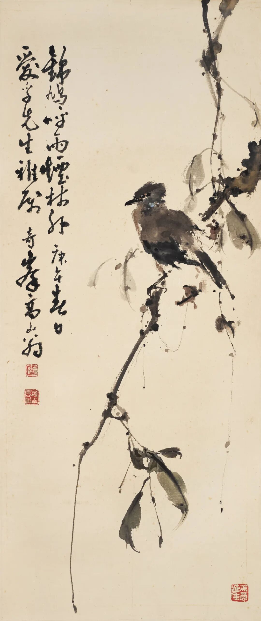 弟大人鉴正。隔山老人居廉写。居廉以花卉为主要题材,偶作人物,此作以朱砂线条绘一钟馗,手持利剑、跨步向前、眼神圆睁、瞪着从天而降的蝙蝠,形态可掬。蝠与福偕音,寓钟馗举剑引蝠之意。此帧以阔笔绘衣纹、转折处方硬有力,动态十足,衣纹下垂飞动,富有力量感,充分体现了钟魁凛然正气的精神特性。由此帧可知居廉艺术造诣的多面性,落款书法更与画作互相辉映。拍品估价:400,000 - 600,000 人民币题签款识:高奇峰先生锦鸠呼雨烟林外真迹。赵少昂题跋,衡庵署签。钤印:美意延年(白文)、奇峰(白文)、岭南高