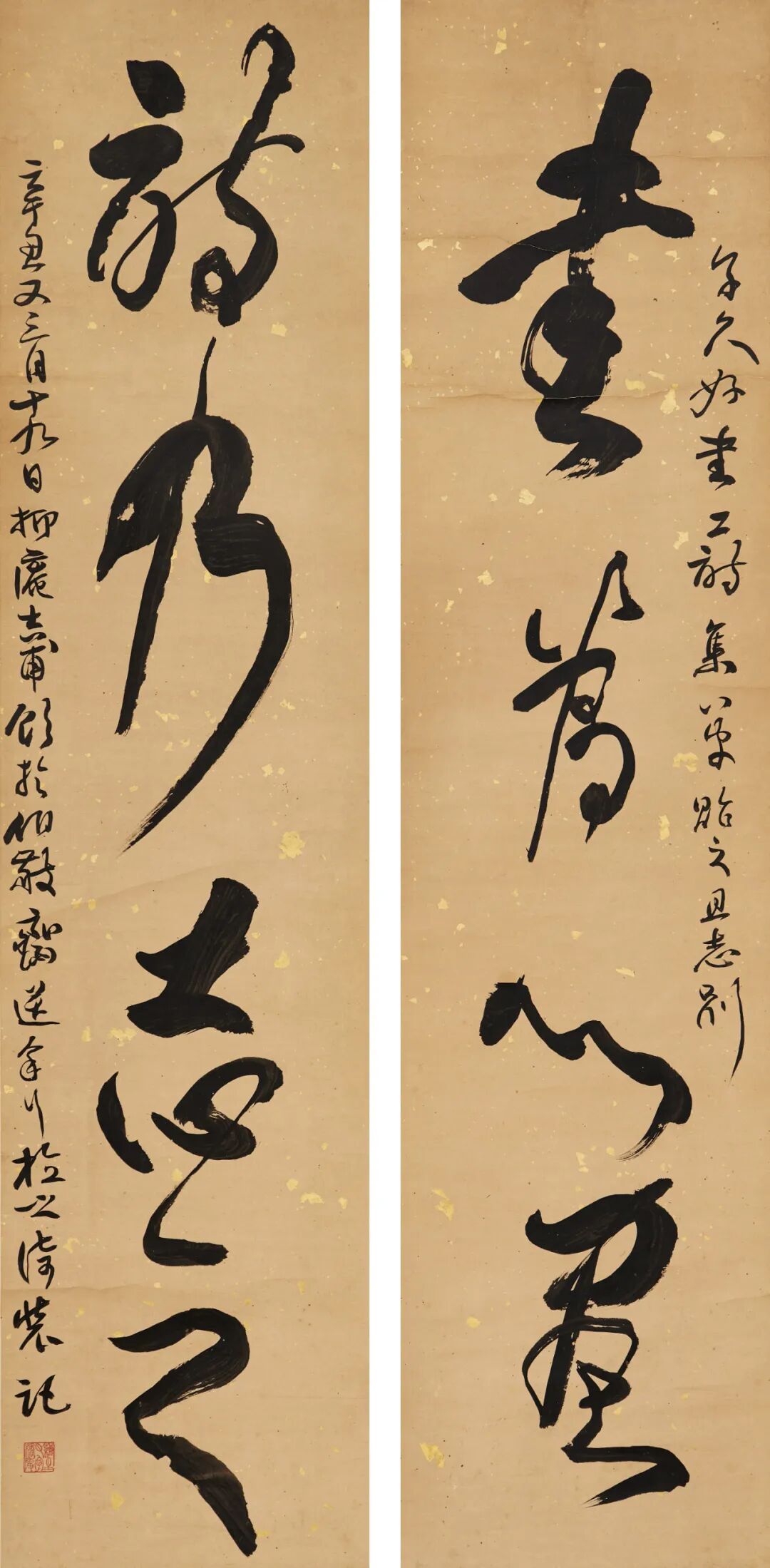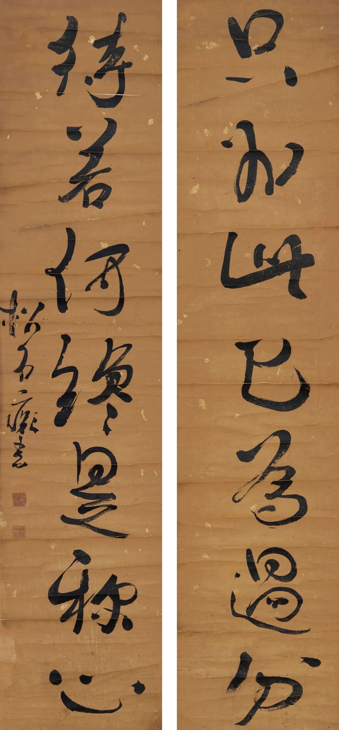 毕业后派往日本考察。善交社会文人名流,与唐文治父子、冯超然、吴湖帆等时有交往,与张元济为姻亲。此《草书七言联》结字大小参差错落,用浓墨渴笔写成。上联起首第一字故意用浓墨写小一些,复渐次变化,偶有一两字用牵丝连结,故有聚有散。下联字形大小、墨色变化则与上联一一呼应。酒字忽然变大,如奇兵突出,出人意料之外,使人观之有“山雨欲来风满楼”之感。拍品估价:80,000 - 120,000 人民币正面释文:一公住世忘世纷,暂来复去谁能分。身寄虚空如过客,心将生灭似浮云。萧散