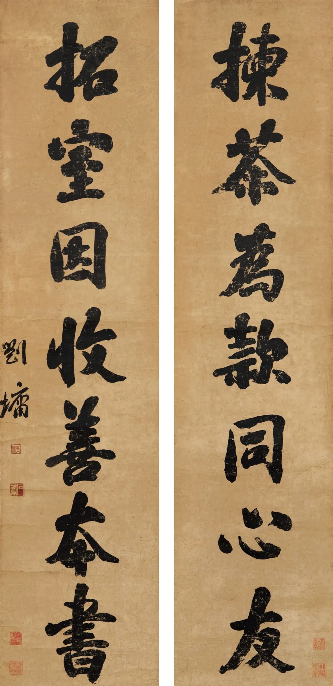 (朱文)备:刘维城旧藏。刘维城,山东诸城人,清代诸城刘氏后裔。曾任山东诸城县留奉补用府供事,著名藏书家。刘墉的《行楷书七言联》为大字行楷书,结体深得东坡神韵,筋骨内含,平正中略有欹侧之态,姿媚可喜,有骨有肉,是典型的刘墉体。封面签条释文(1):先文正公手录诗册(五、六言绝句)。封面签条释文(3):先文正公手录诗册(七言绝句)。鉴藏印:东武刘氏世藏(朱文)四次、诵先人之清芬(朱文)四次、东