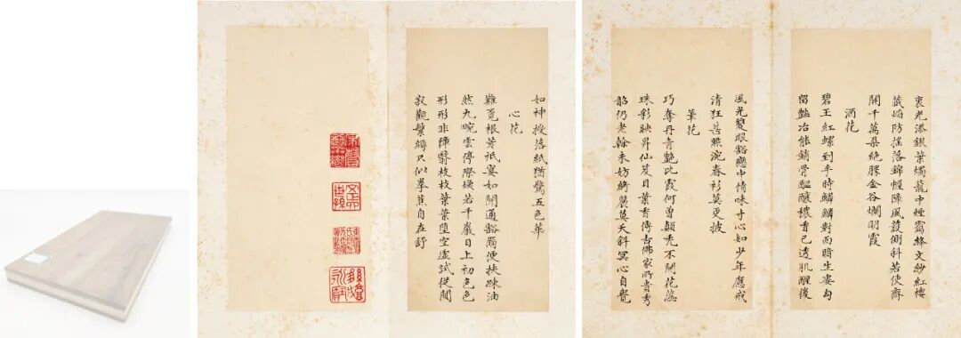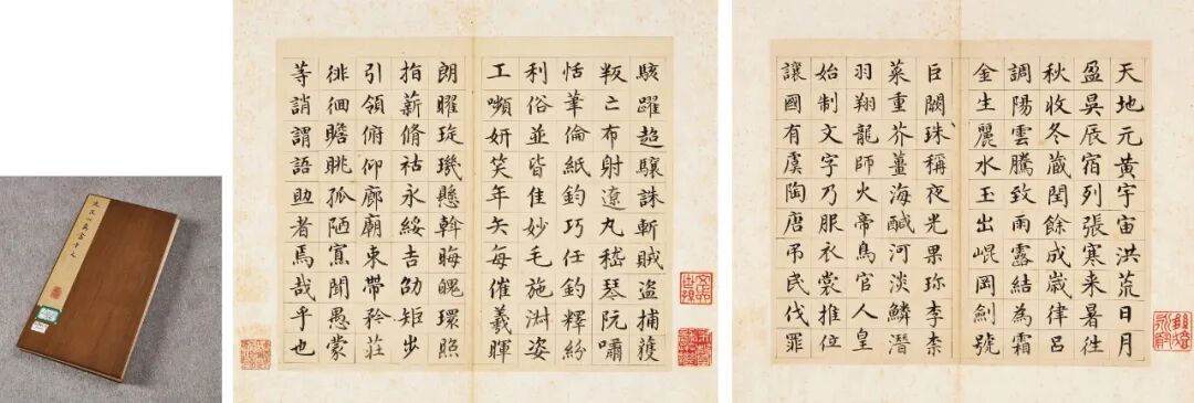 继(白文)、东武刘氏宝藏先世遗迹之印(朱文)以上三件拍品皆是刘墉父亲刘统勋手迹。书写内容分别是诗册、应制诗和《千字文》,大部分用正楷书写,可见其治学之严谨。尺寸:137×34cm×2,约 4.2 平尺 / 张钤印:勤以补拙(朱文)、刘壿(白
