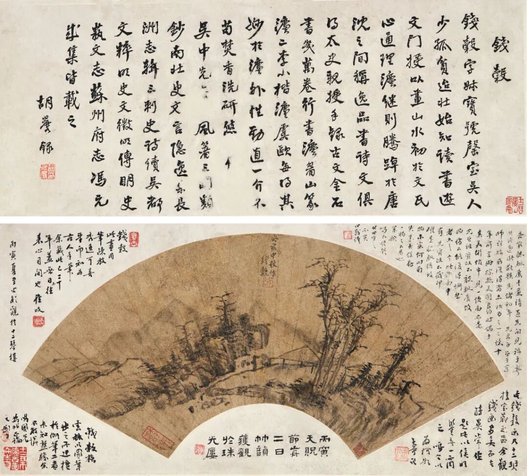 剑父赵少昂等同为“南社”之友。钱穀的《山水》有苍逸古秀、孤高拔俗之致。钱穀是吴门画派的重要代表人物之一。他主张绘画师法造化,曾说:“丹青者,熔以法,模以天。”此幅钱穀《山水》,有法度,有灵气。画法仿倪元林笔意,着意表现秋天空林落木、清寂高旷的景致,借景抒情,传达出寻胜访幽的文人雅趣。此画上钤有“季彤秘玩”朱文长方章,知此帧亦是清代潘正炜(字季彤)听帆楼旧藏之物,崔鸣周递藏,胡兆麐、程竹韵、潘治戡、麦公敏、胡剑庵题跋,实属难得。崔鸣周当年以藏有二百面明金扇面相矜于收藏界同侪,此当为其中之一也。冒襄印痕注释款识:此印文曰“冒襄巢民辟彊”,章法甚奇,