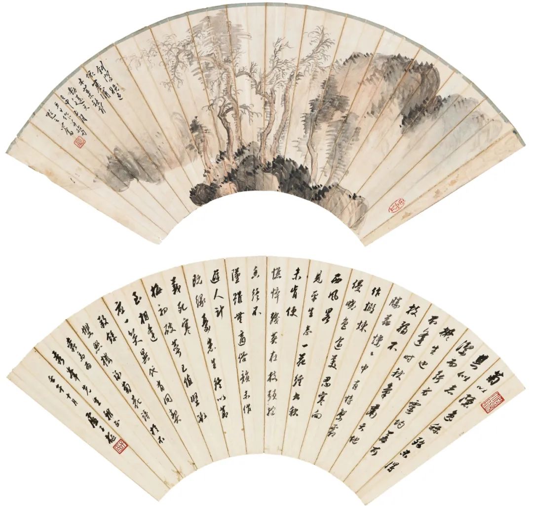 杭州国立艺专教授,国立北平师范学院讲师等职。1949年后,任中国美术家协会华东分会副主席,中央美术学院华东分院教授。一九二三年,黄宾虹时居上海,年58岁,收到了一样非常珍贵的礼物,就是这把由苏州过云楼后人、名士、书画家兼大收藏家顾麟士写山水,状元、实业家张謇录东坡诗二首的成扇。顾麟士与黄宾虹同庚,时年也是58岁。顾麟士此作仿元代赵孟頫《吴兴清远图》笔意,淡雅秀丽,明快清新。点苔沉着老健,大可与赵孟頫相颉颃。背面的张謇书法则直入晋人之室,大得二王法意,用笔圆健浑厚,老笔纷披。拍品估价:200,000 - 300,000 人民币钤印:争艳(白文)、关良(白文)