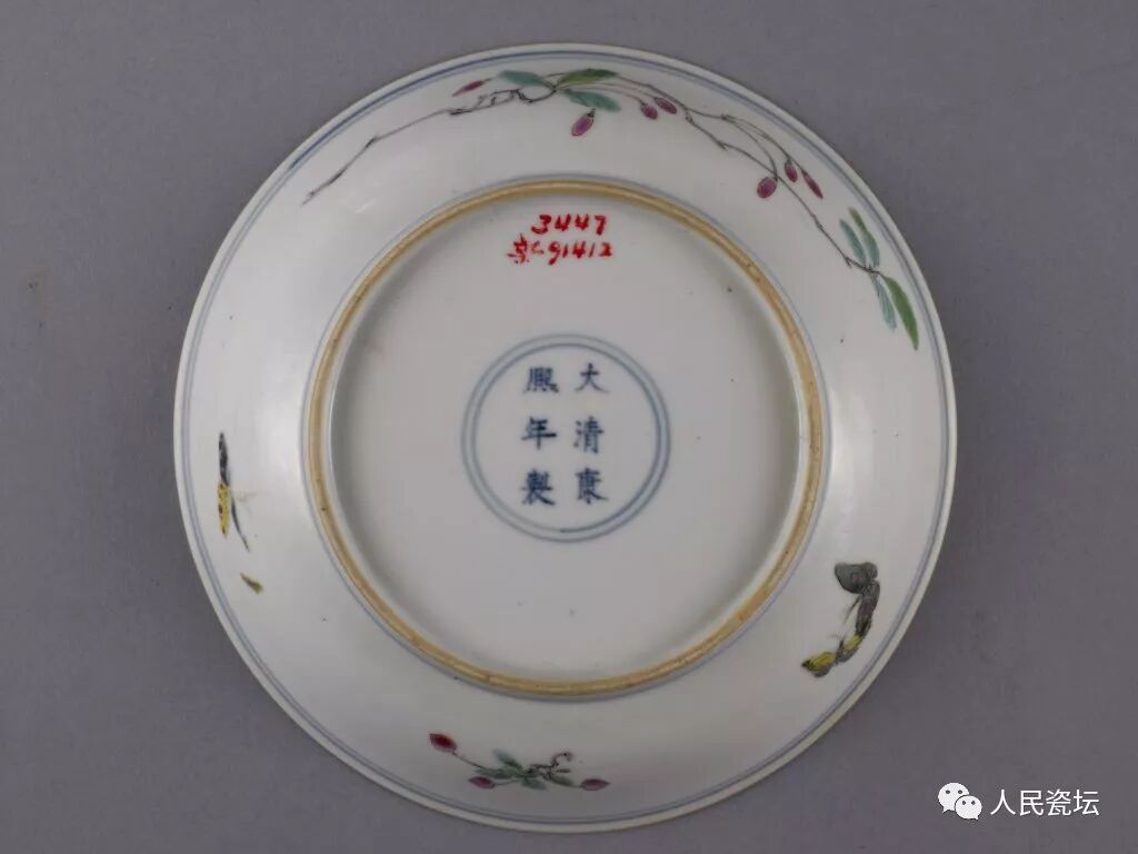粉彩瓷器初创于康熙晚期,是在五彩的基础上受珐琅彩瓷器的影响而创烧出的一种新型彩瓷。康熙粉彩瓷器处于初创阶段,造型有盘、水丞等。此盘用平涂法绘画,画笔简练,施彩较厚,色阶不够丰富,显示出粉彩瓷器初创阶段的特点。此种盘也见署楷体“大明成化年制”仿款者。