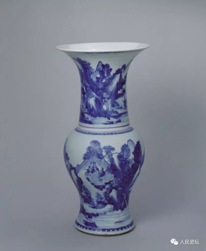 青花山水人物图凤尾尊,清康熙,高43.7cm,口径22.8cm,足径15cm。