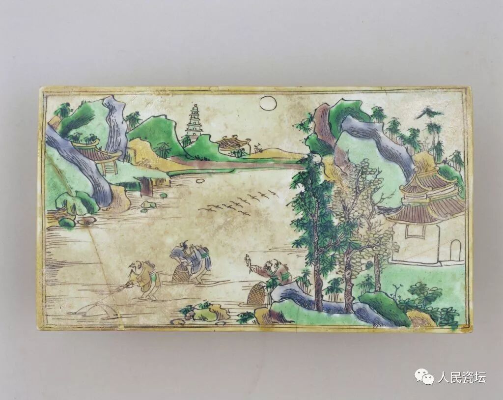 素三彩渔夫捕鱼图长方几,清康熙,高7.5cm,面纵23.5cm,面横13.5cm,足纵17.7cm,足横11.5cm。