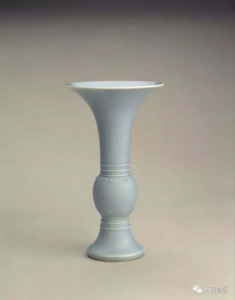 瓷制花觚始见于元代,明清时多有烧制。除景德镇烧制外,尚有龙泉窑、德化窑等地制品。主要品种有青花、五彩、颜色釉等,多为陈设用品。这件花觚釉色匀净,十分雅致。