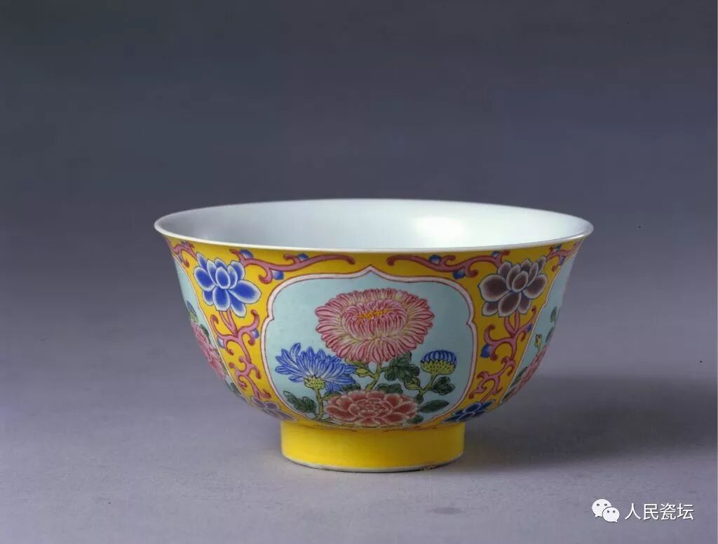 黄地开光珐琅彩花卉纹碗,清康熙,高6cm,口径10.8cm,足径4.4cm。