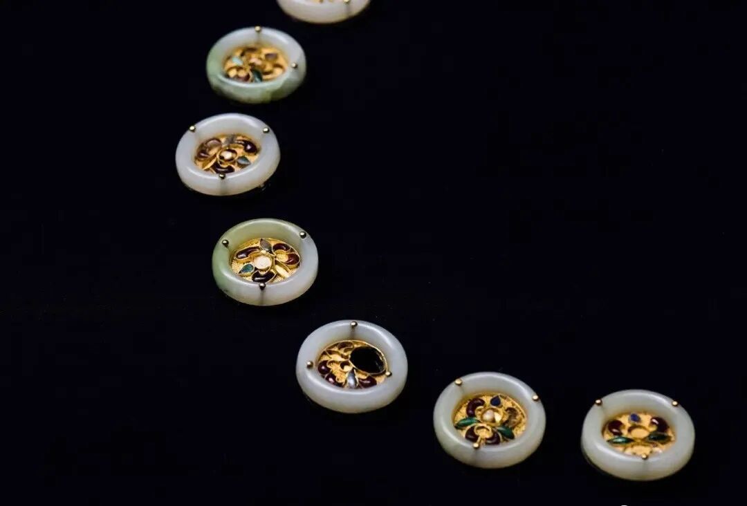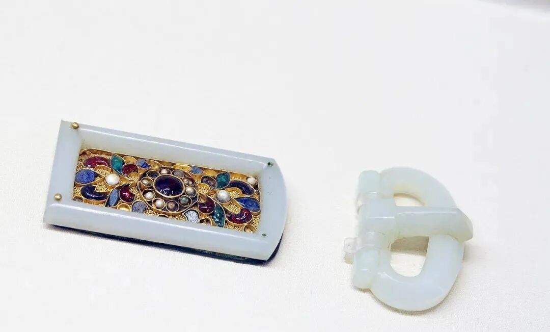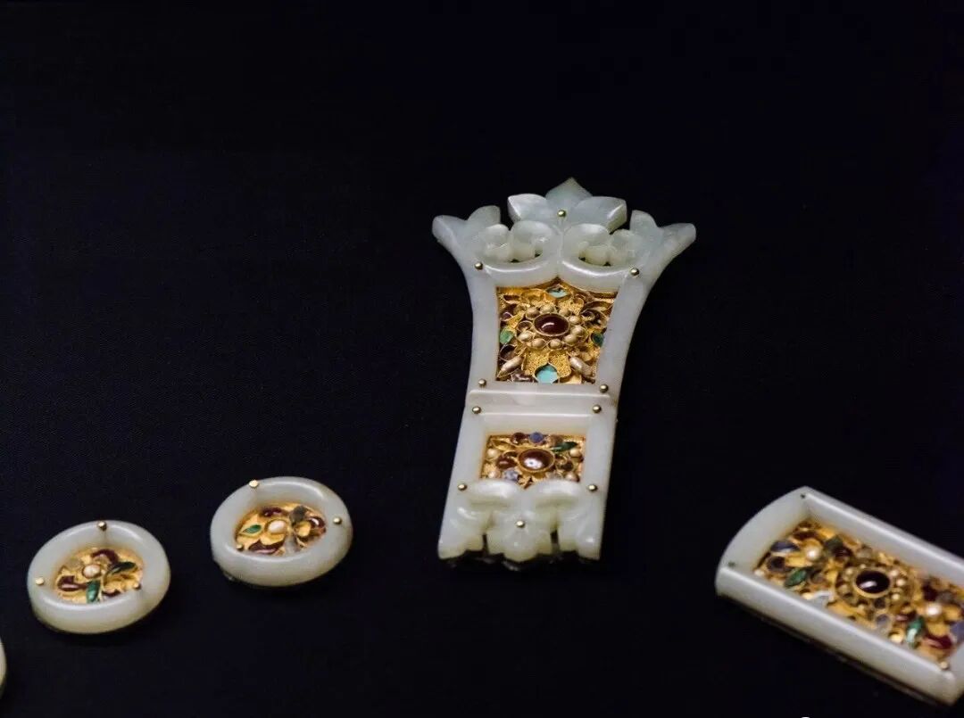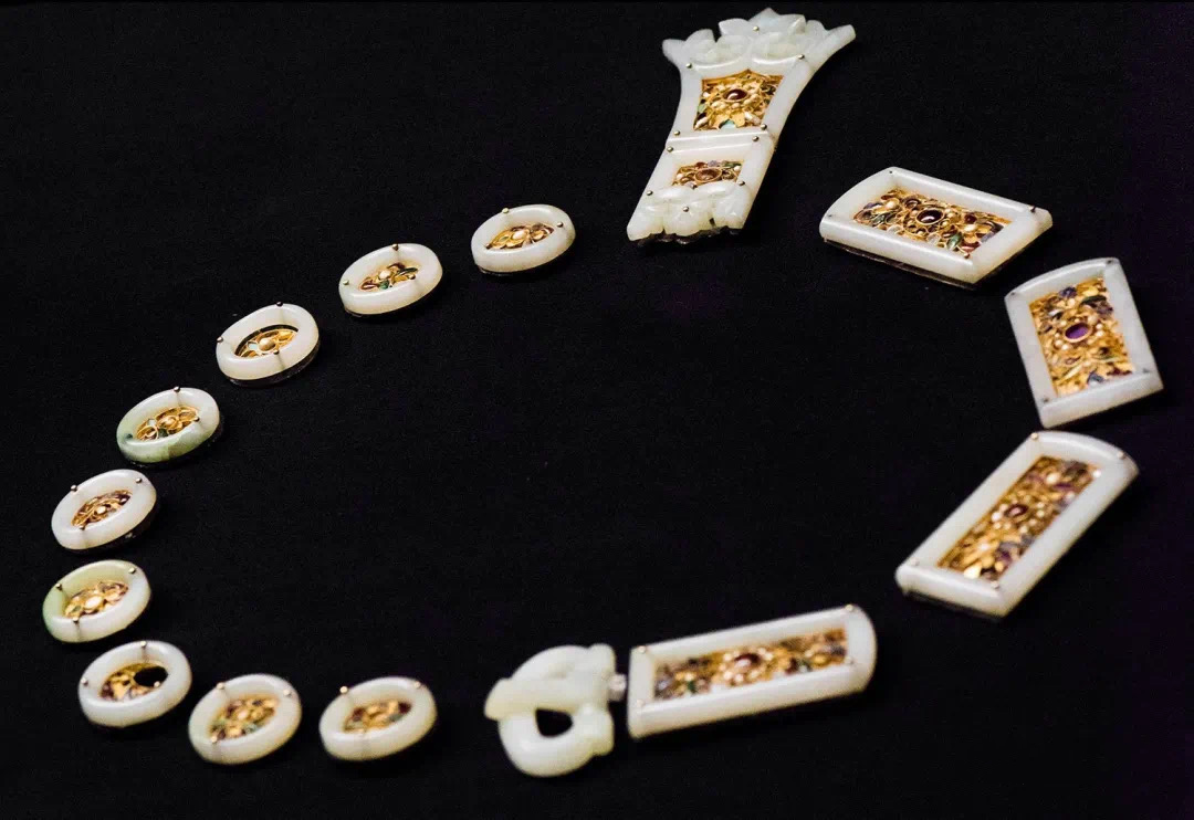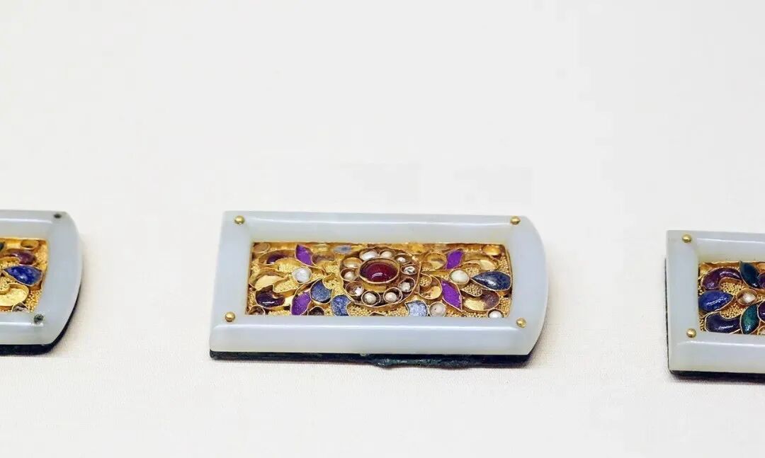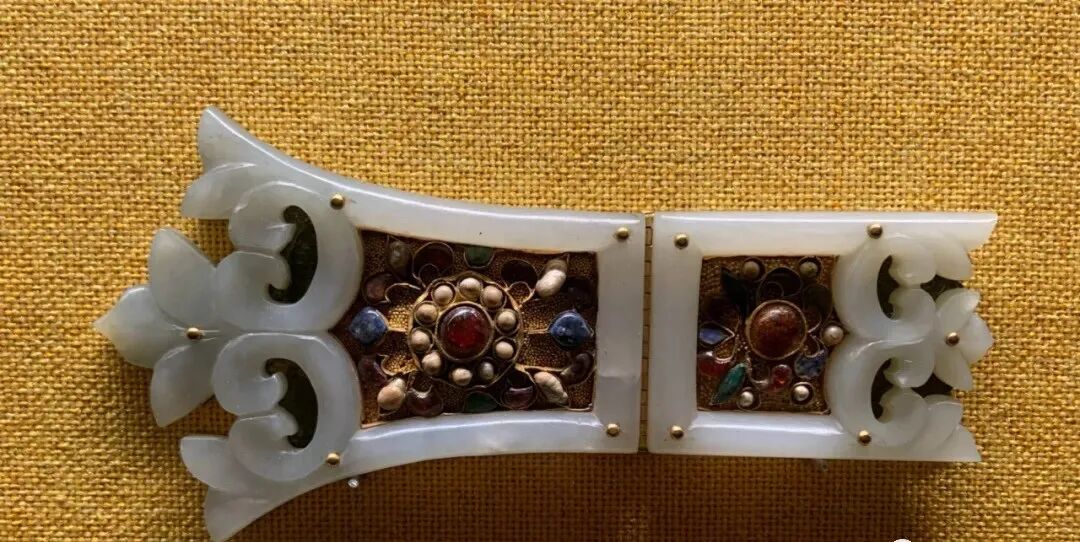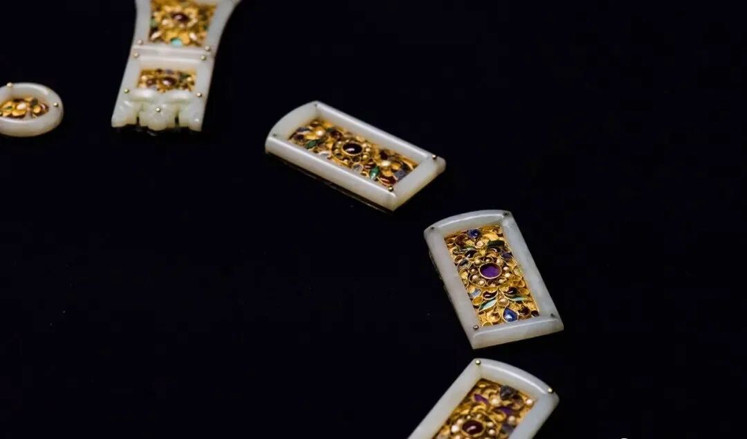 这条玉带表框皆以青白玉制作,部分泛浅绿。玉表框在唐代文献中又称为“玉梁”,框内为精美绝伦的“金筐宝钿真珠装”。