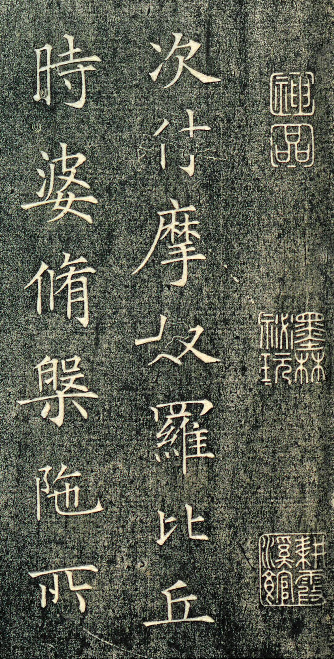 薛稷《涅槃经帖》楷书,扬州市图书馆藏拓,附翁方纲80岁小楷题跋。薛稷的书法“用笔纤瘦”,出于刻意,乃一时代作风,不仅薛稷如此,他的堂兄弟薛曜更少丰润。薛稷书法出自褚遂良,虽有新意,别具风神,但因“超石鼠之效能,愧隋珠之掩类”,未能尽脱褚氏规模而在四家最为逊色。薛稷(649年—713年),字嗣通,。唐朝大臣、书画家。薛稷在武周时期举进士出身,转中书舍人,迁谏议大夫、昭文馆学士。唐玄宗先天二年(713年),太平公主与宰相窦怀贞等重臣密谋政变,薛稷因知情不报,于万年县狱中被赐死,时年65岁。工于书法,与褚遂良,欧阳询、虞世南并列“初唐四大书法家”,代表作《信行禅师碑》。善于绘画,长于人物、佛像、树石、花鸟,精于画鹤,有《啄苔鹤图》等作品传世。【释文】次付摩奴罗比丘;时婆脩槃陁所应作已便捨其;命次付比丘摩奴罗令其流布;无上胜法彼摩奴罗智慧超胜;少欲知足勤脩若行言辞要妙;悦可众心善能通达三藏之义;于南而笁兴大饶益。