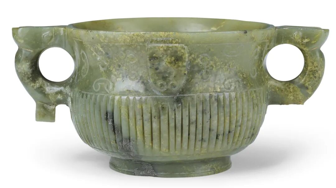 口径10、底径6、高7厘米。器作簋形,青玉质,直口,微束颈,鼓腹。颈部饰有卷云纹,腹外壁以浮雕手法精琢直线纹,颈腹间两侧各饰一兽首耳,耳下垂珥,一珥残缺,下呈喇叭形圈足。
